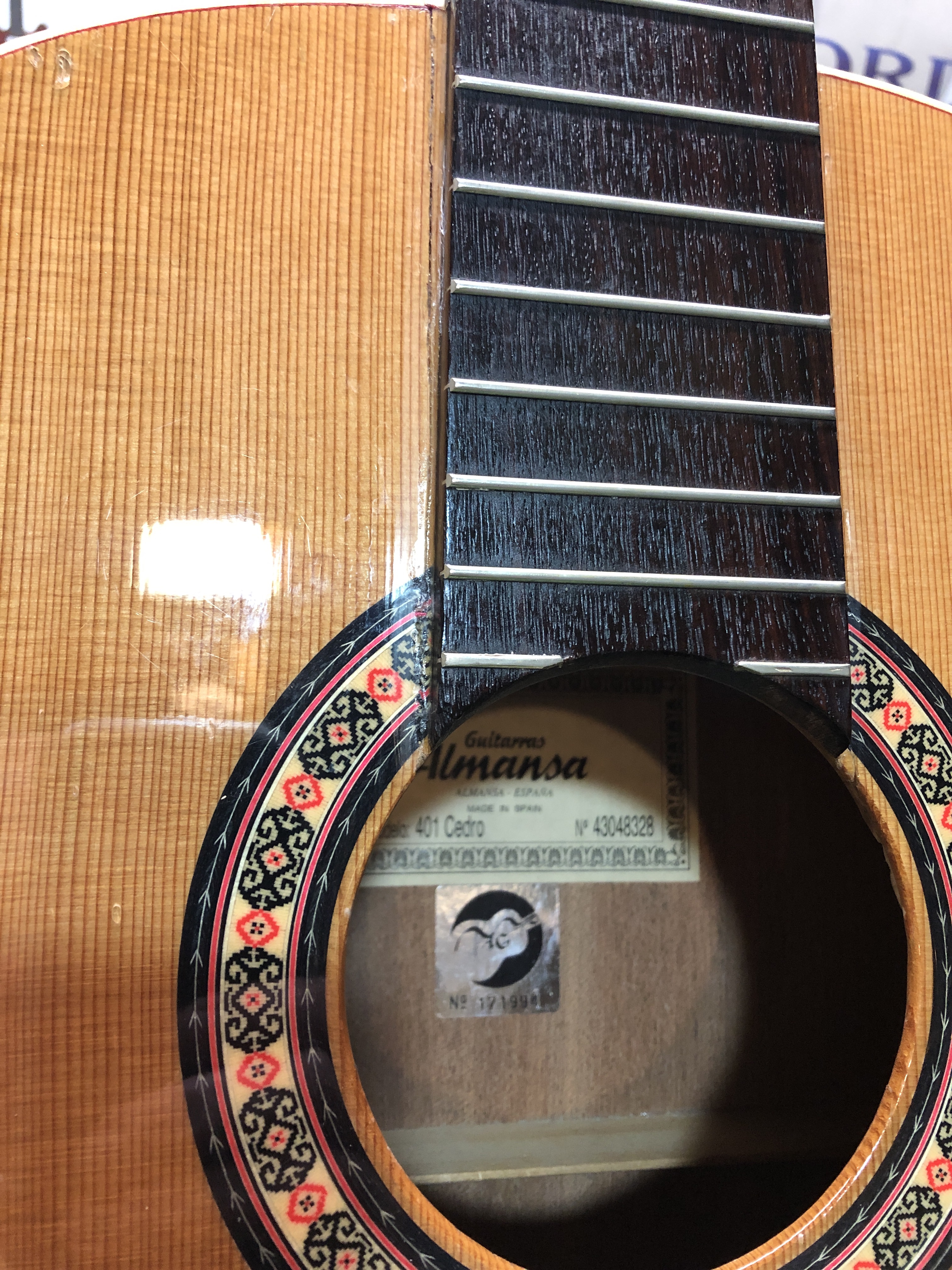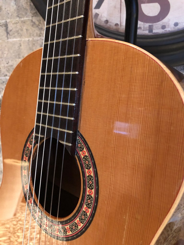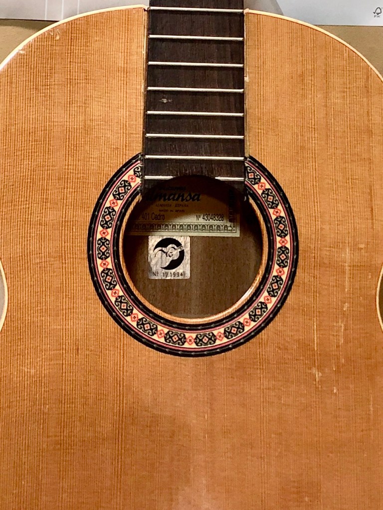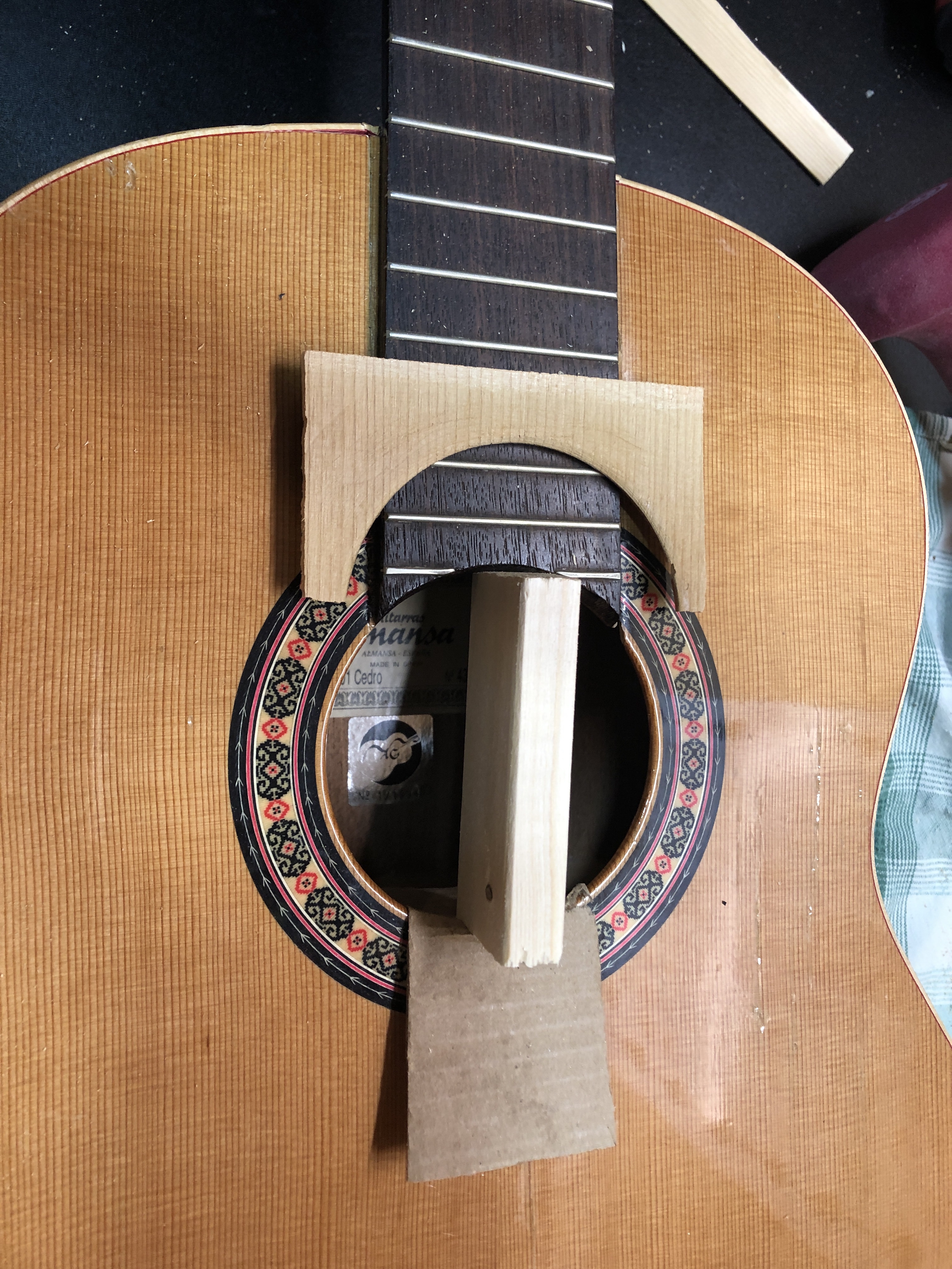 Pretty proud of this novice restoration. My kid’s school has a pretty good guitar program, of course mostly using good sturdy Yamahas. A while ago they got a couple of very nice solid cedar top Almansa guitars to add to the mix. Well, good solid top guitars don’t mix well with rough junior high school students and an storage room that is not climate controlled. Both Almansa guitars broke, the top simply split right down both sides of the neck and the neck block folded in. One guitar also had been pretty badly destroyed in other places too. They were both destined for the bone yard, so I convinced the guitar teacher to let me try and rescue the one by cannibalizing bits of the other one. I cut pieces out on one of the cedar tops to make bracing and cleats for the other. The photos below show the damage and the repair progress.