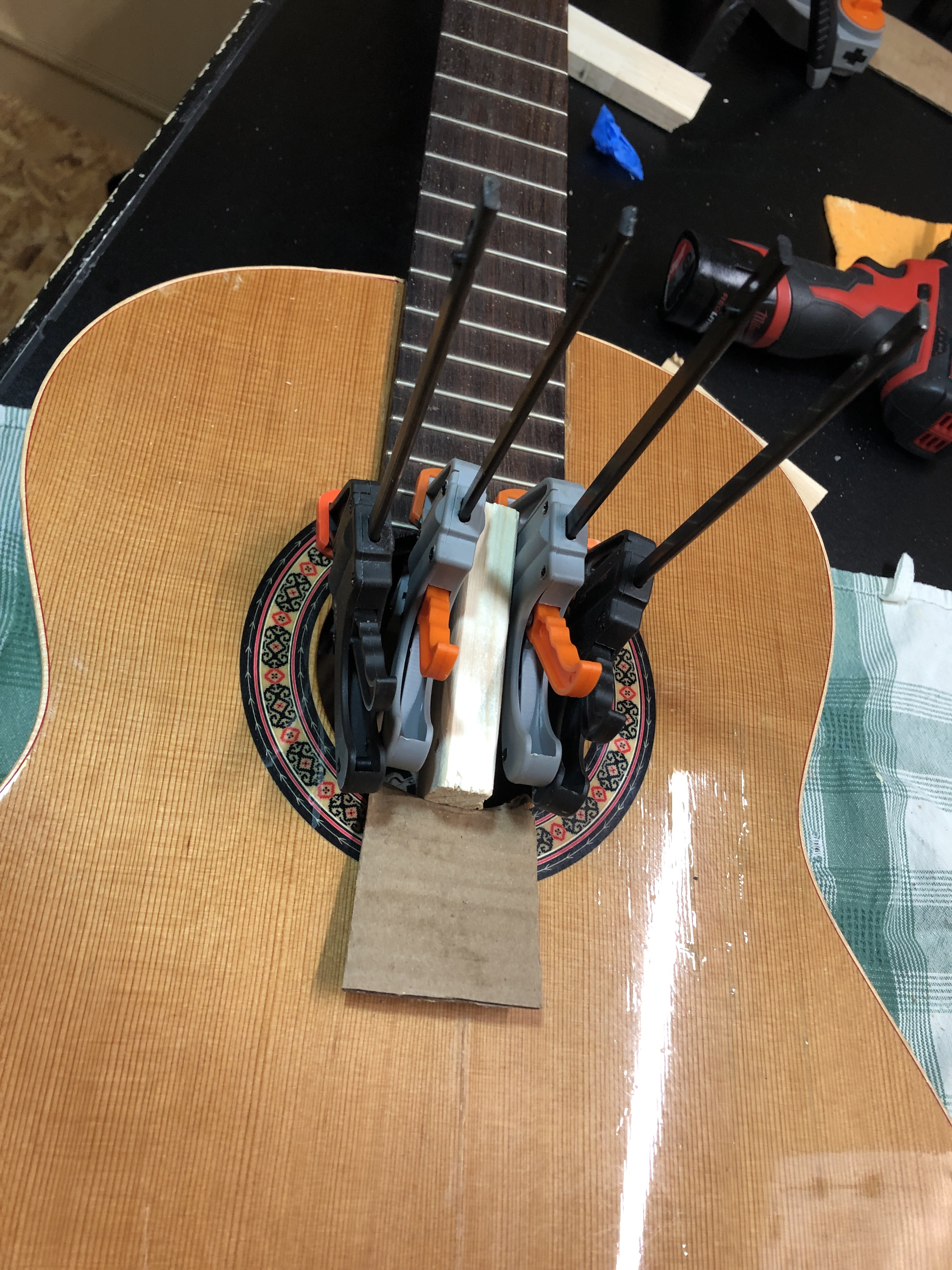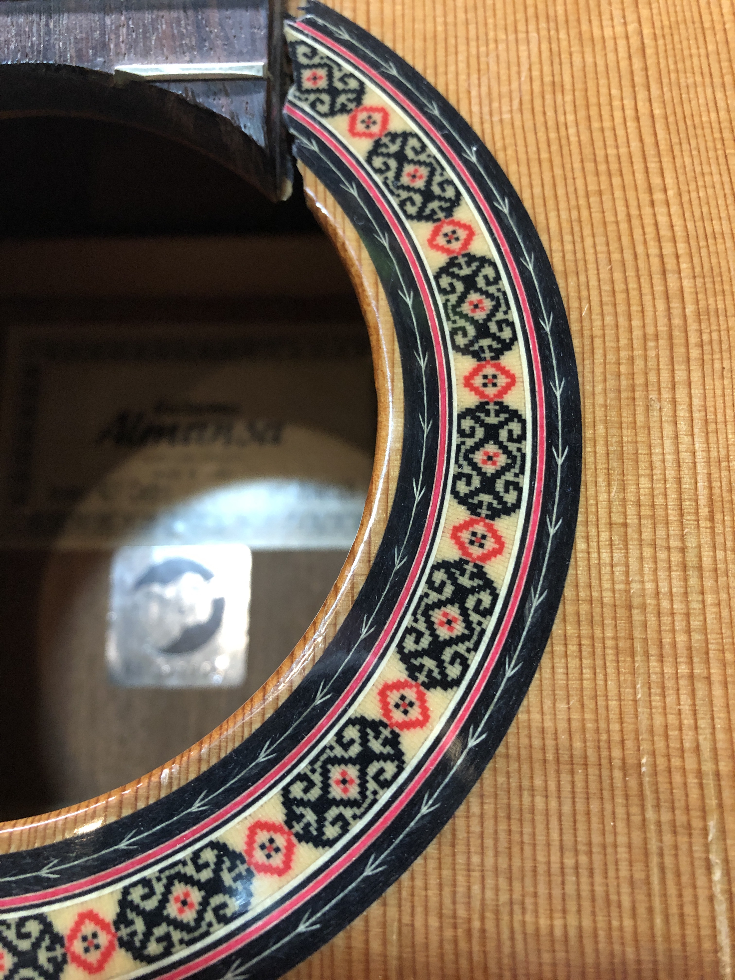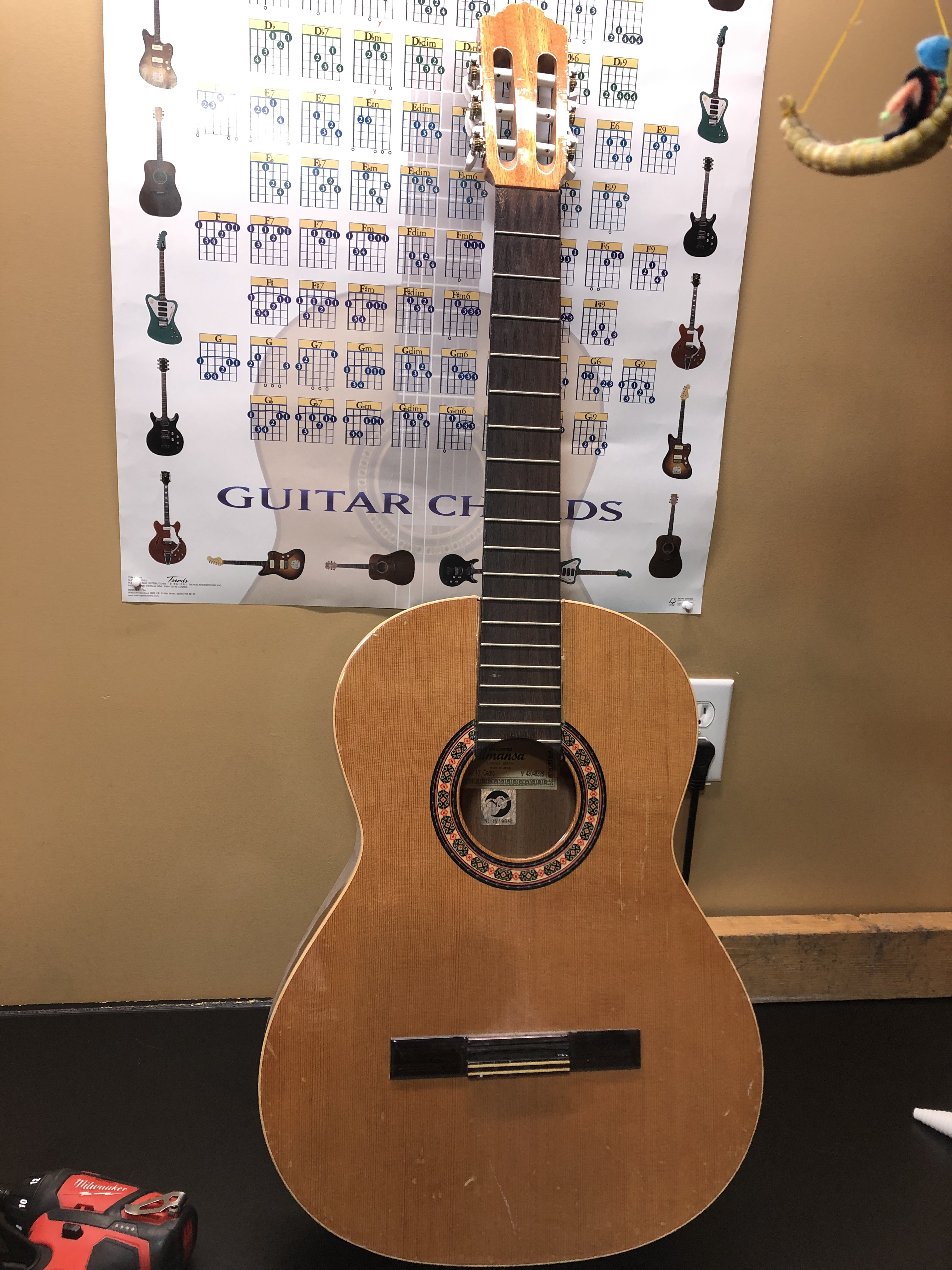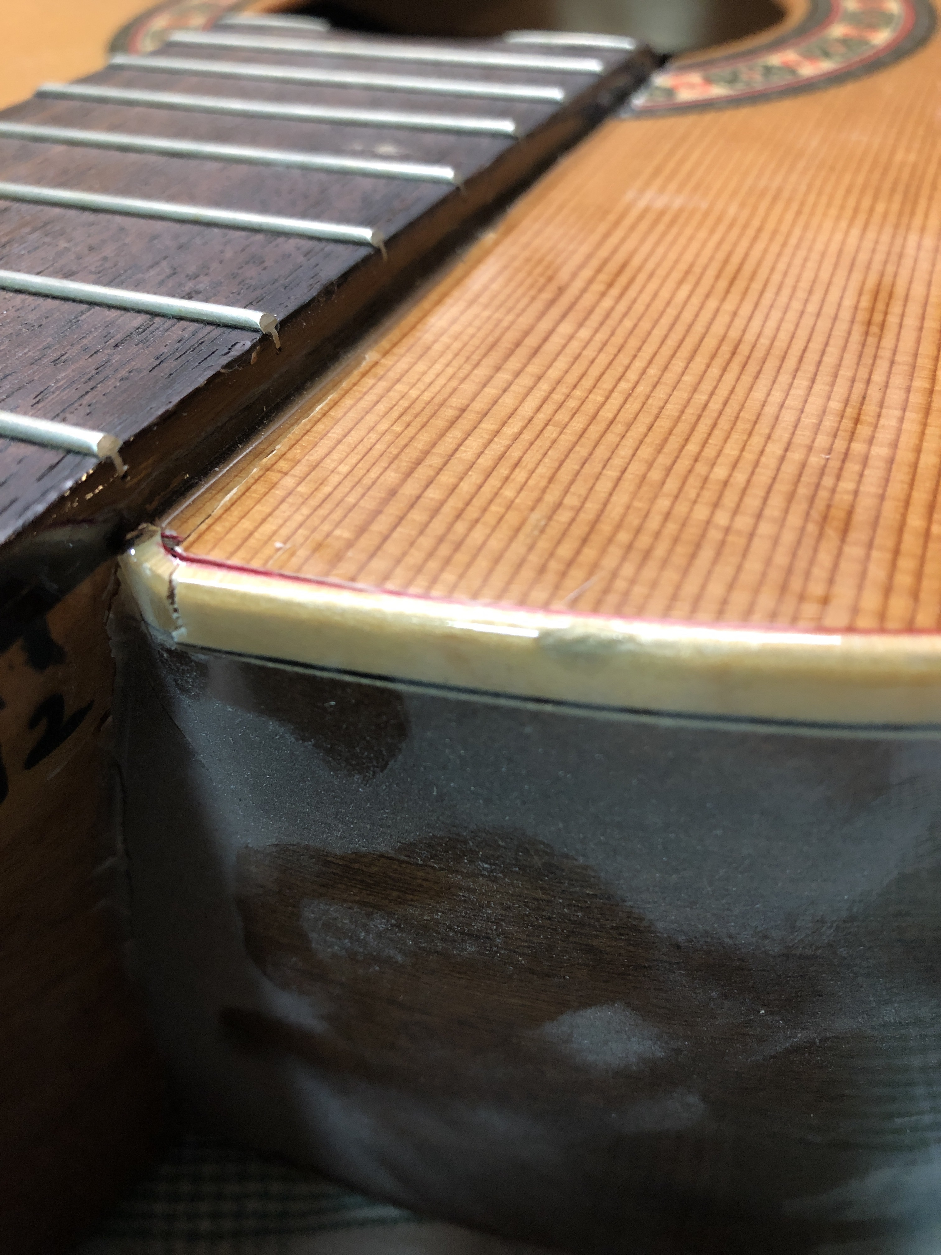 Pretty proud of this novice restoration. My kid’s school has a pretty good guitar program, of course mostly using good sturdy Yamahas. A while ago they got a couple of very nice solid cedar top Almansa guitars to add to the mix. Well, good solid top guitars don’t mix well with rough junior high school students and an storage room that is not climate controlled. Both Almansa guitars broke, the top simply split right down both sides of the neck and the neck block folded in. One guitar also had been pretty badly destroyed in other places too. They were both destined for the bone yard, so I convinced the guitar teacher to let me try and rescue the one by cannibalizing bits of the other one. I cut pieces out on one of the cedar tops to make bracing and cleats for the other. The photos below show the damage and the repair progress.