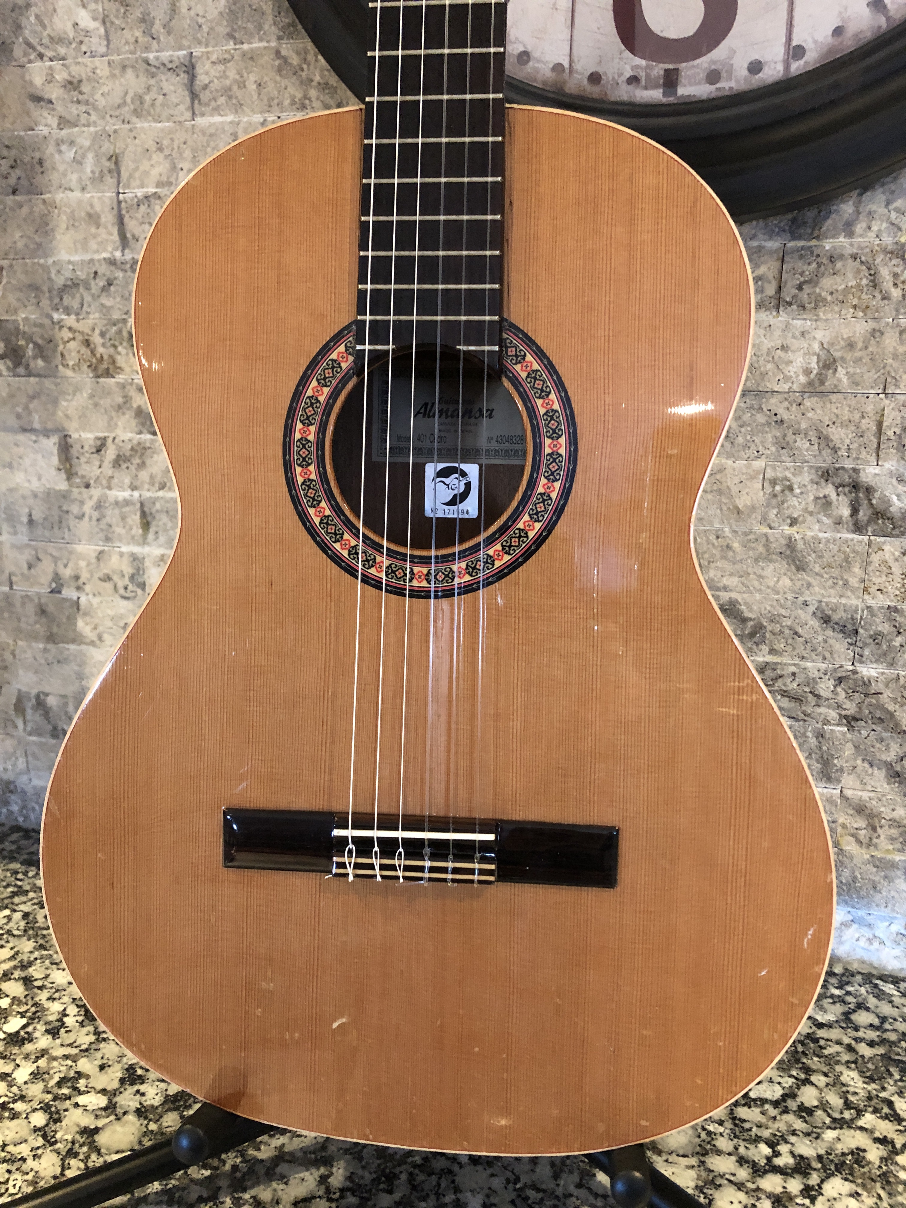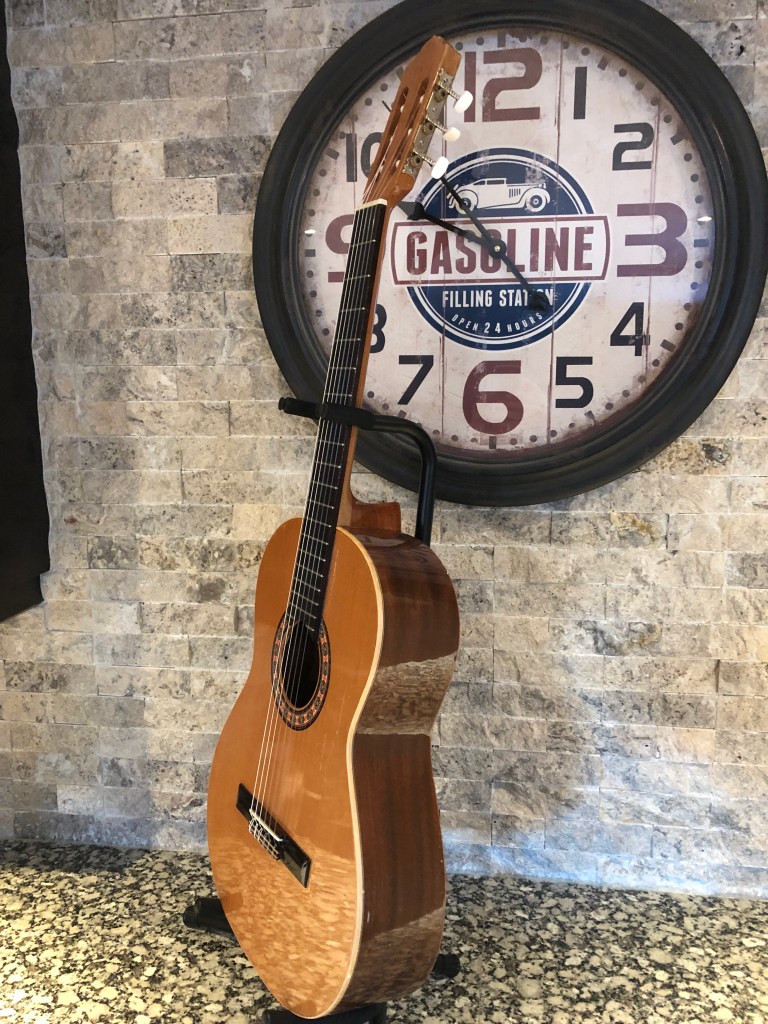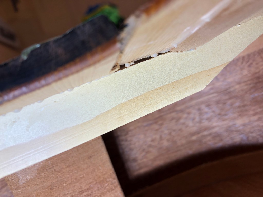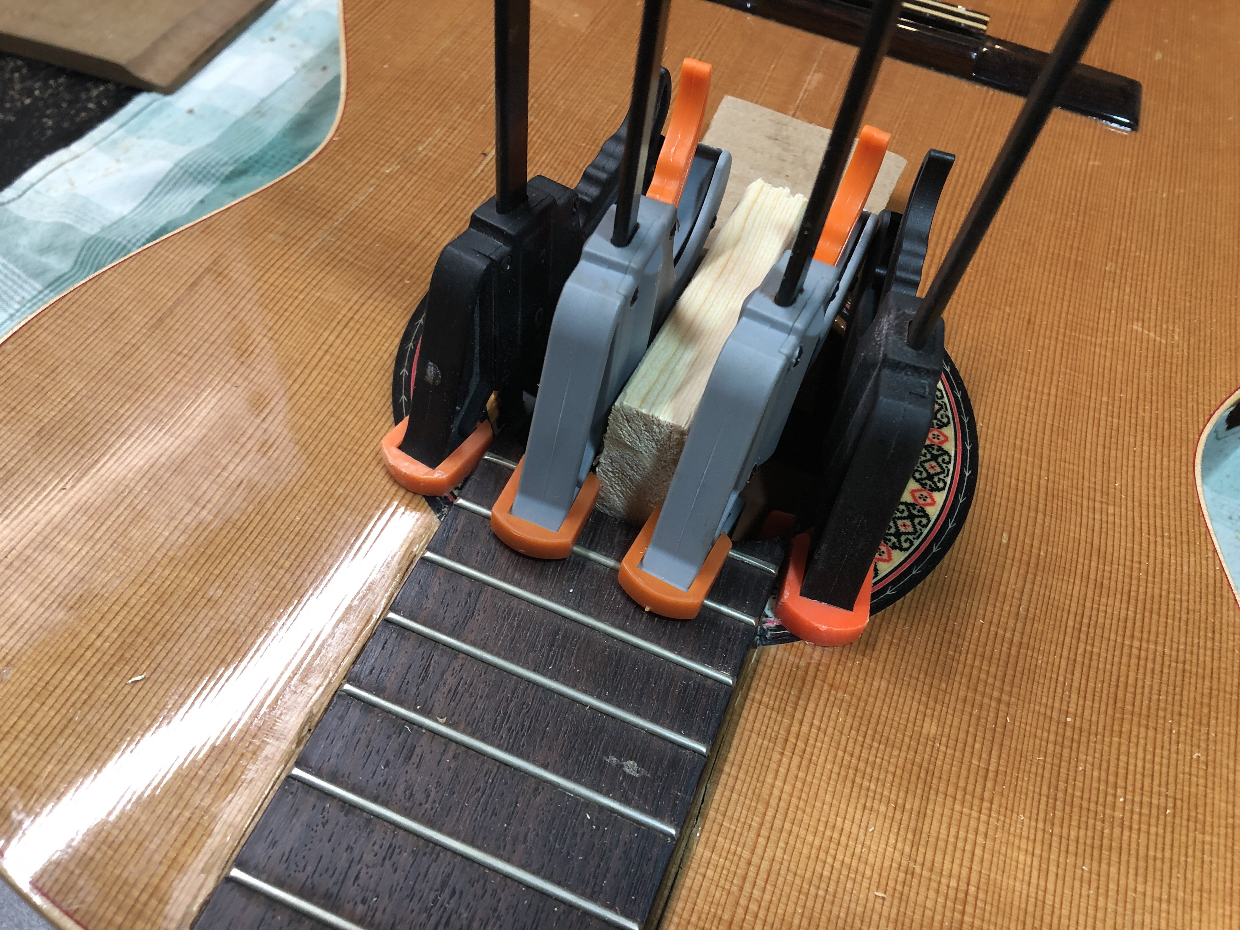Pretty proud of this novice restoration. My kid’s school has a pretty good guitar program, of course mostly using good sturdy Yamahas. A while ago they got a couple of very nice solid cedar top Almansa guitars to add to the mix. Well, good solid top guitars don’t mix well with rough junior high school students and an storage room that is not climate controlled. Both Almansa guitars broke, the top simply split right down both sides of the neck and the neck block folded in. One guitar also had been pretty badly destroyed in other places too. They were both destined for the bone yard, so I convinced the guitar teacher to let me try and rescue the one by cannibalizing bits of the other one. I cut pieces out on one of the cedar tops to make bracing and cleats for the other. The photos below show the damage and the repair progress.