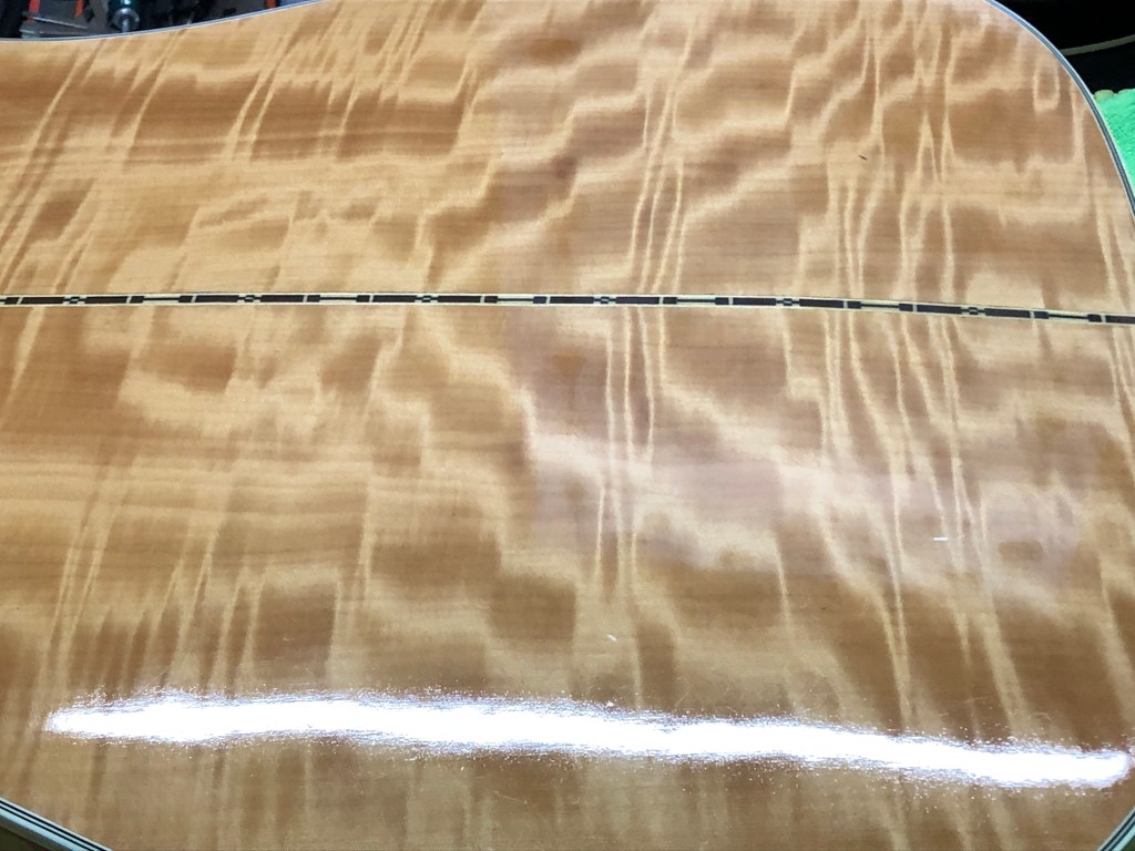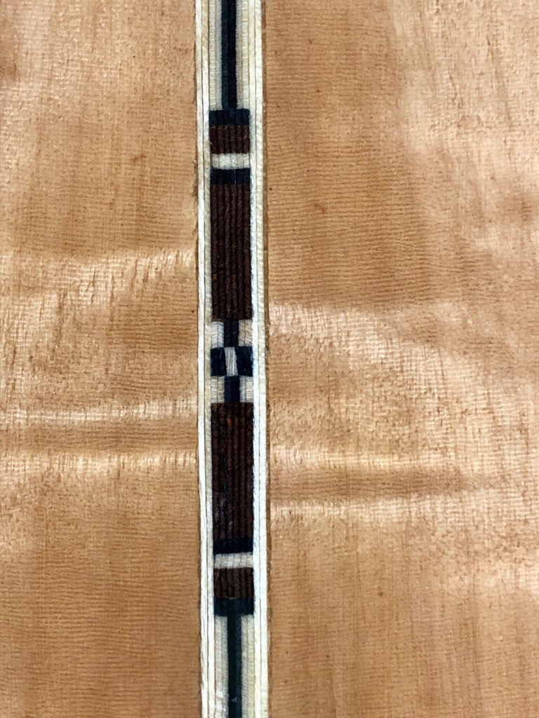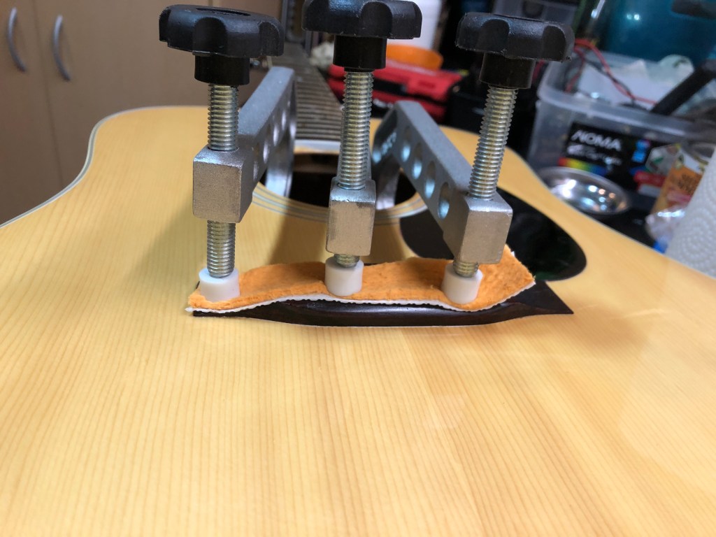 The bridge was lifting and twisted, and there was a bit of a belly happening. I experimented with a “bridge-on” belly reduction by cutting a hardwood caul to fit between the X bracing under the bridge. Then I clamped the bridge lightly and used a clothes steamer to soften the belly and the bridge, slowly tightening the clamps until everything was flush. Then I let it sit overnight to stabilize. The next morning everything held shape nicely and all I had to do was inject some glue under the bridge and clamp it again for another day. Everything turned out great.