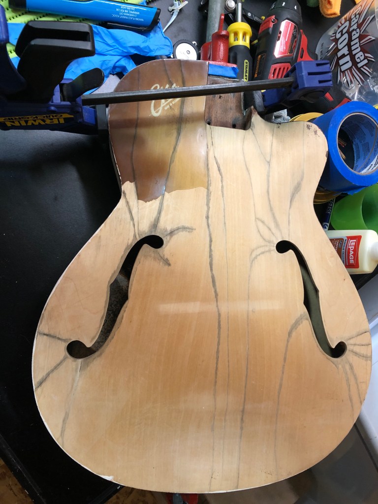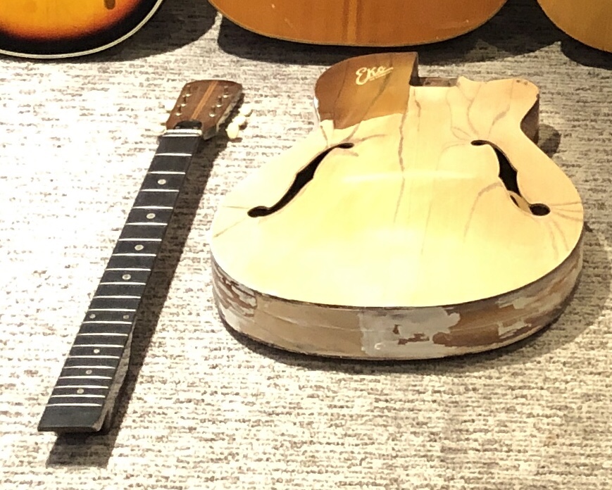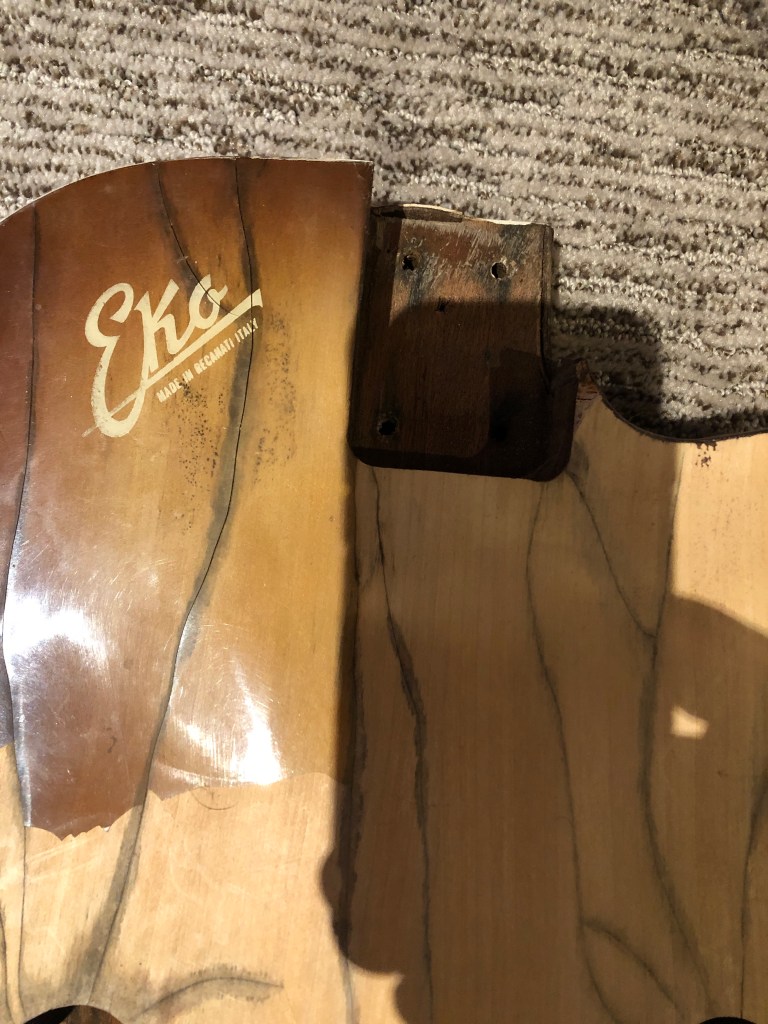 An acquaintance found this old 60’s Eko (made in Italy) in a garbage can out in the rain. Most of the finish was gone. The top was cracked and had lots of water damage. The top and bottom had partially separated from the body. The fret board was all swollen and deeply cracked. Many of the frets had partially popped out. One of the tuning button posts was badly bent. The neck mounting screws were rusted and the list goes on. This one probably should have been left in the garbage, but hey, I’m a sucker for a challenge.