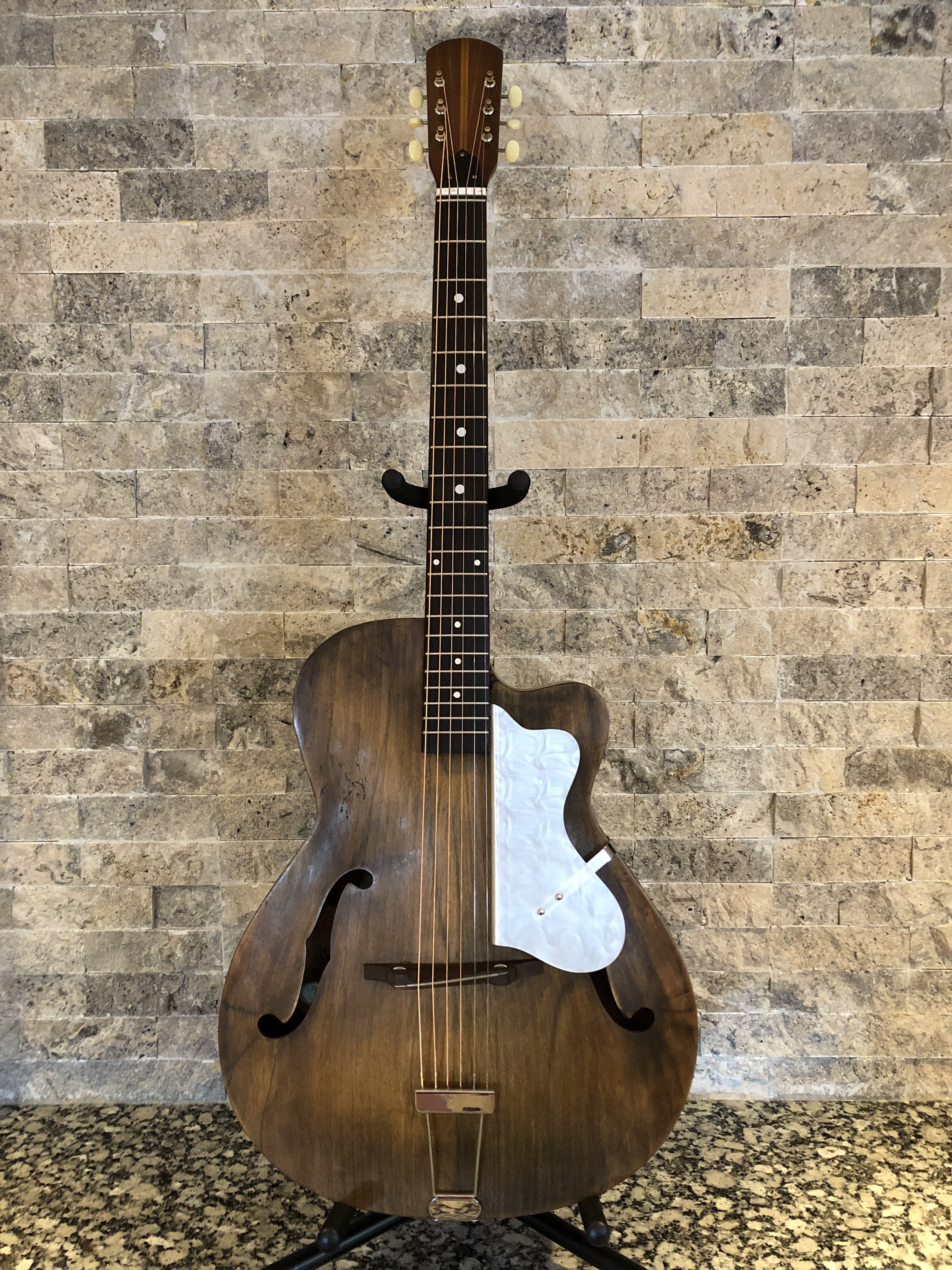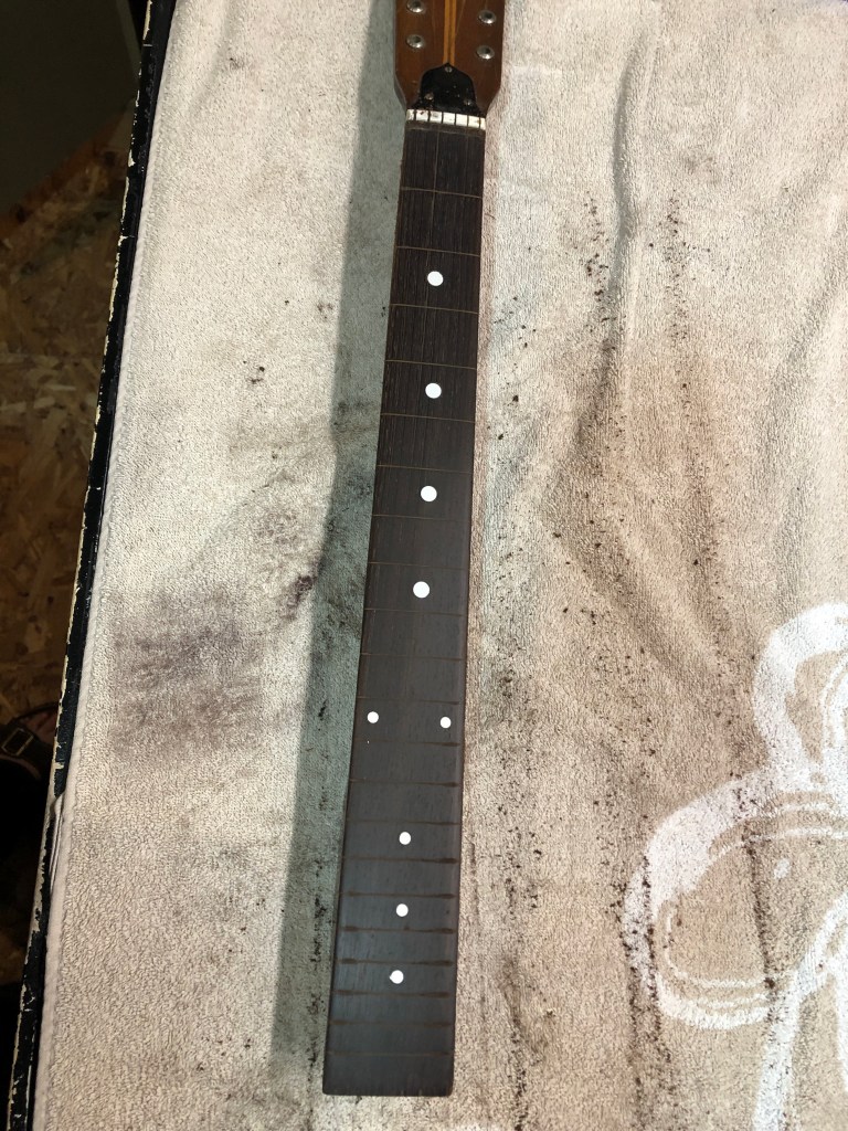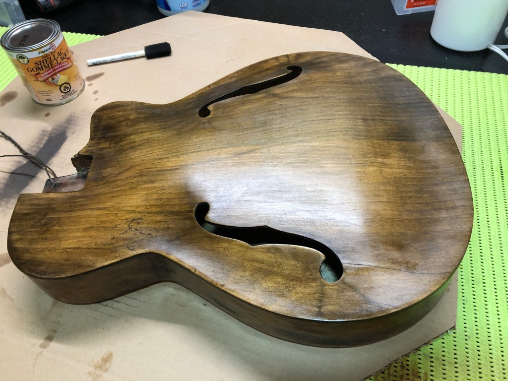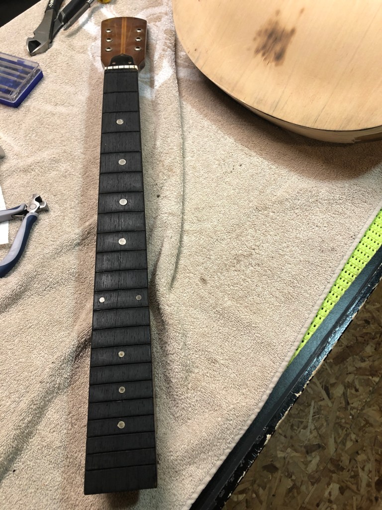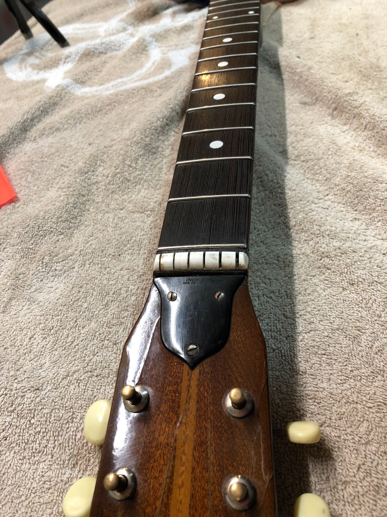 Here is the photographic progression as I worked both the neck and the body – sanded and re-fretted the neck, fixed the original tuning machines, re-glued the body back together, sanded & stained & French polished the body. Reassembled and setup. The nice thing is that all the hardware, including the tuners, pick guard, tailpiece and bridge are all original – they just needed a ton of work to make them look good again.