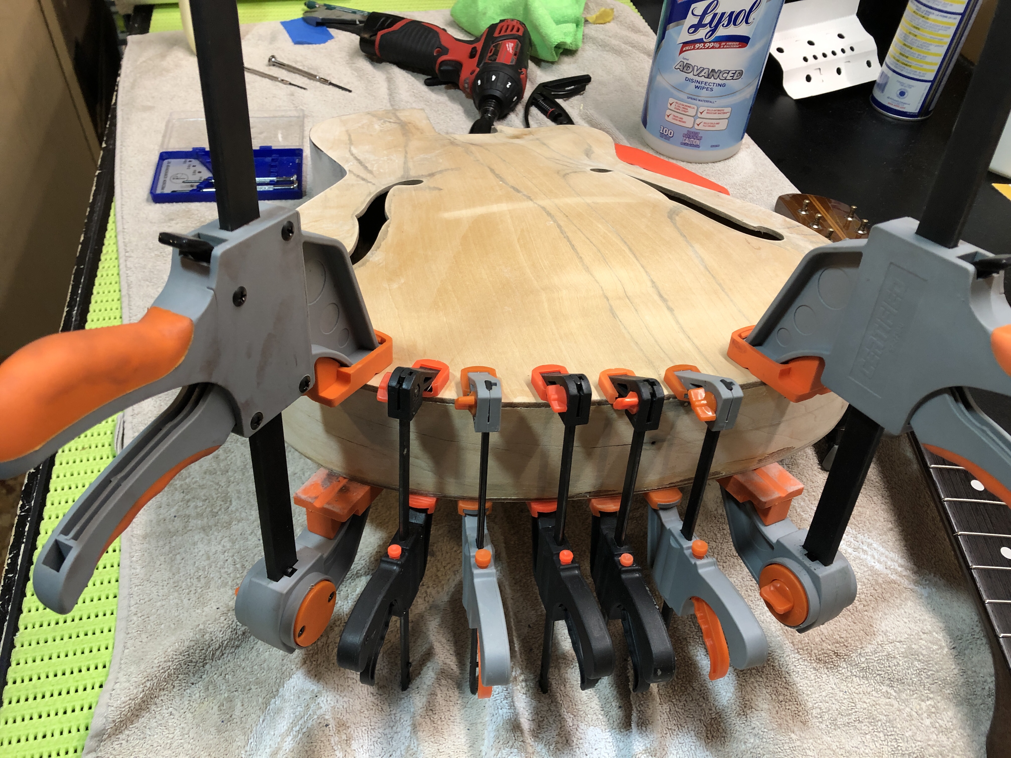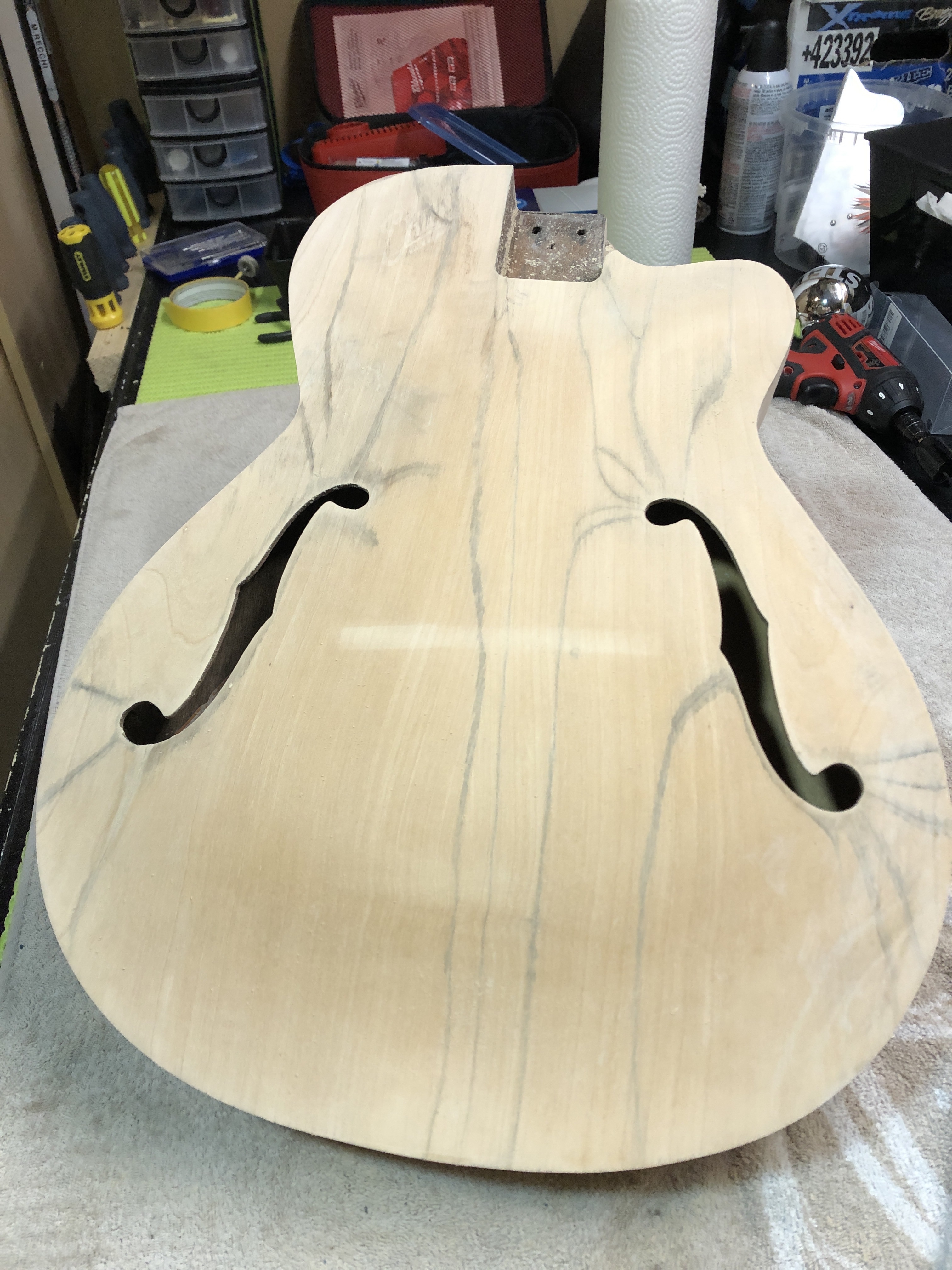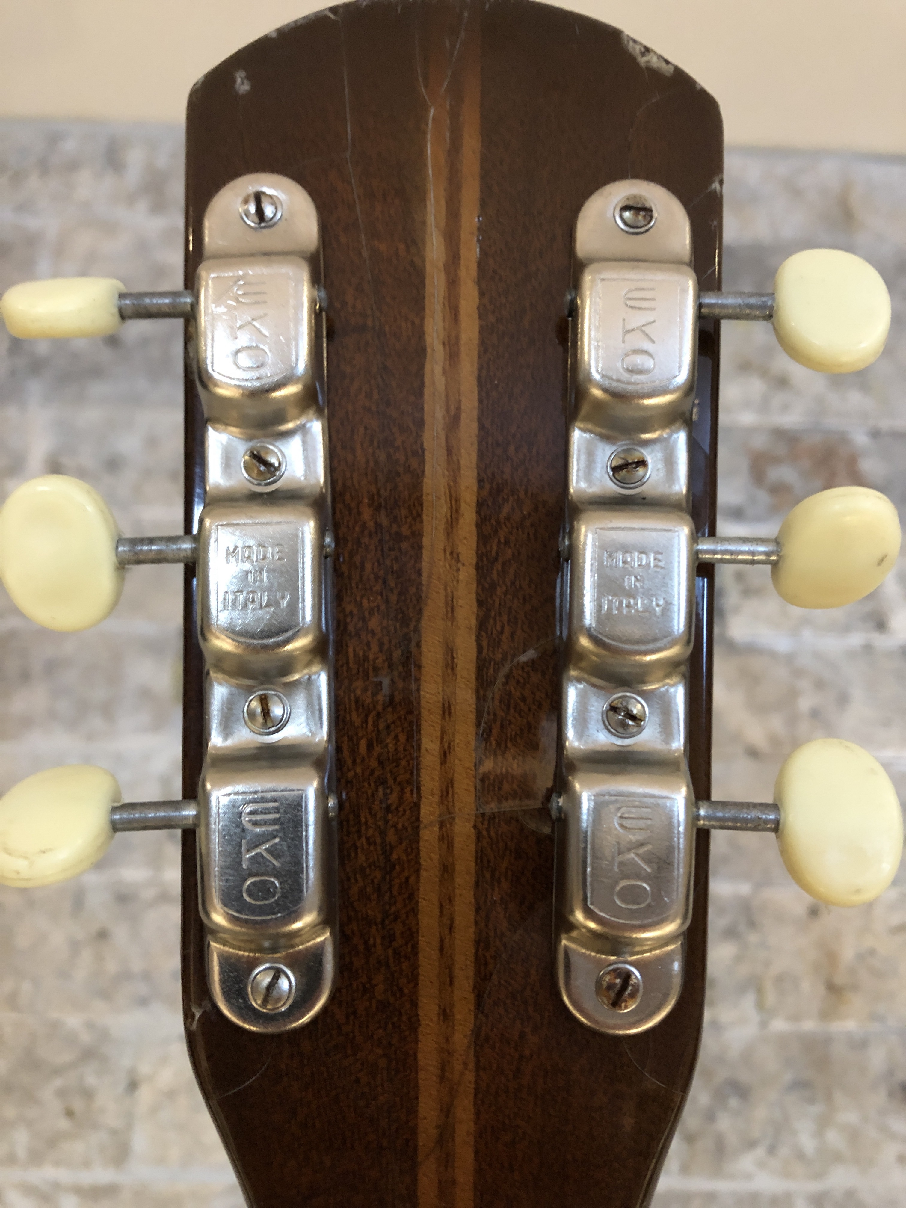 Here is the photographic progression as I worked both the neck and the body – sanded and re-fretted the neck, fixed the original tuning machines, re-glued the body back together, sanded & stained & French polished the body. Reassembled and setup. The nice thing is that all the hardware, including the tuners, pick guard, tailpiece and bridge are all original – they just needed a ton of work to make them look good again.