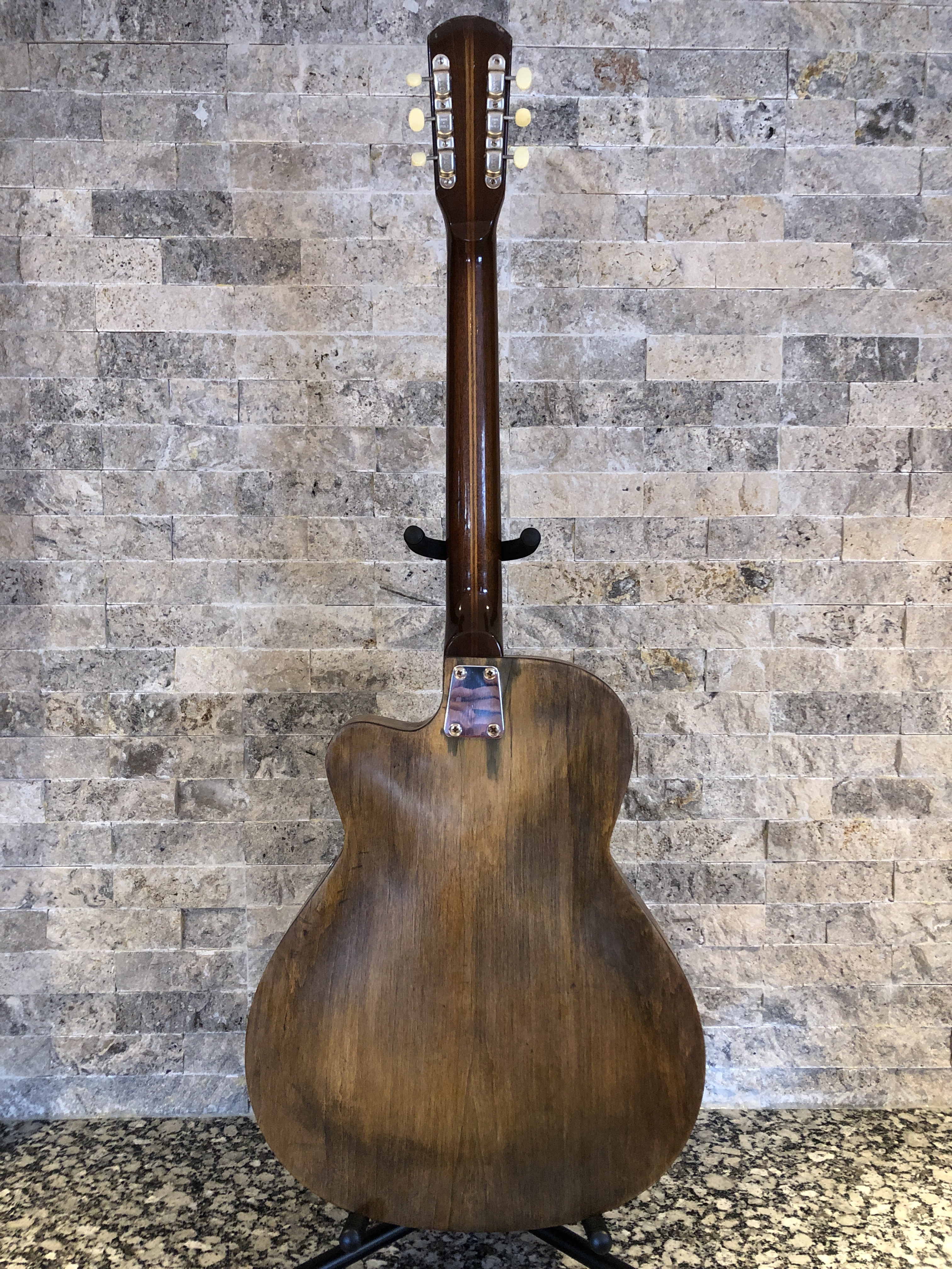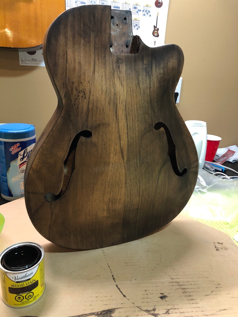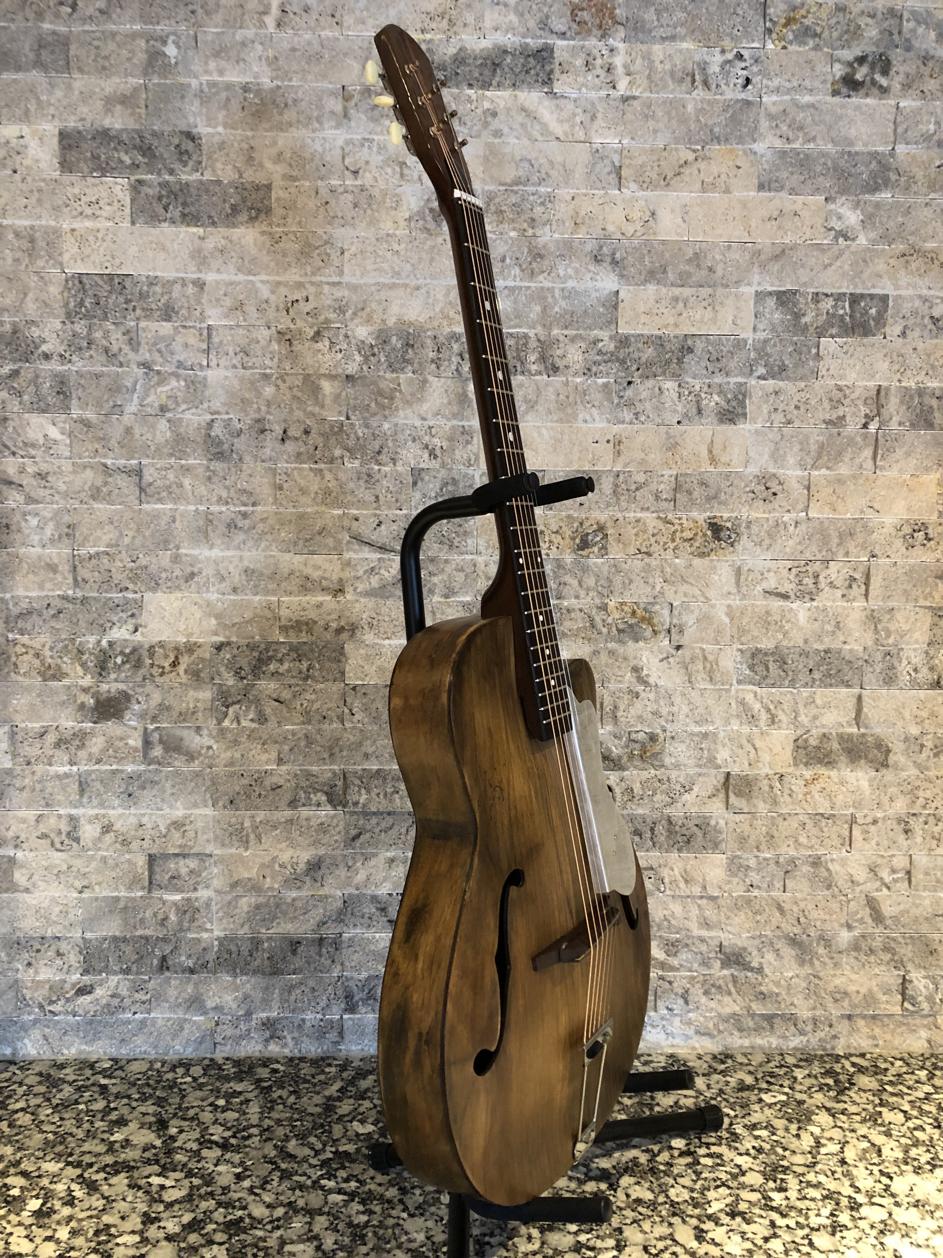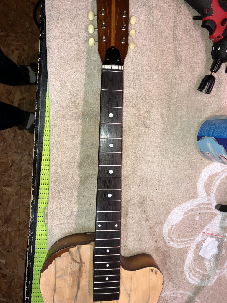 Turned out pretty well in my humble opinion. I finished it to intentionally look like a distressed and aged instrument (it was pretty distressed after all). The neck colour doesn’t quite match the body, but hey, it came out of a water filled garbage can – what do you want?!? 😆