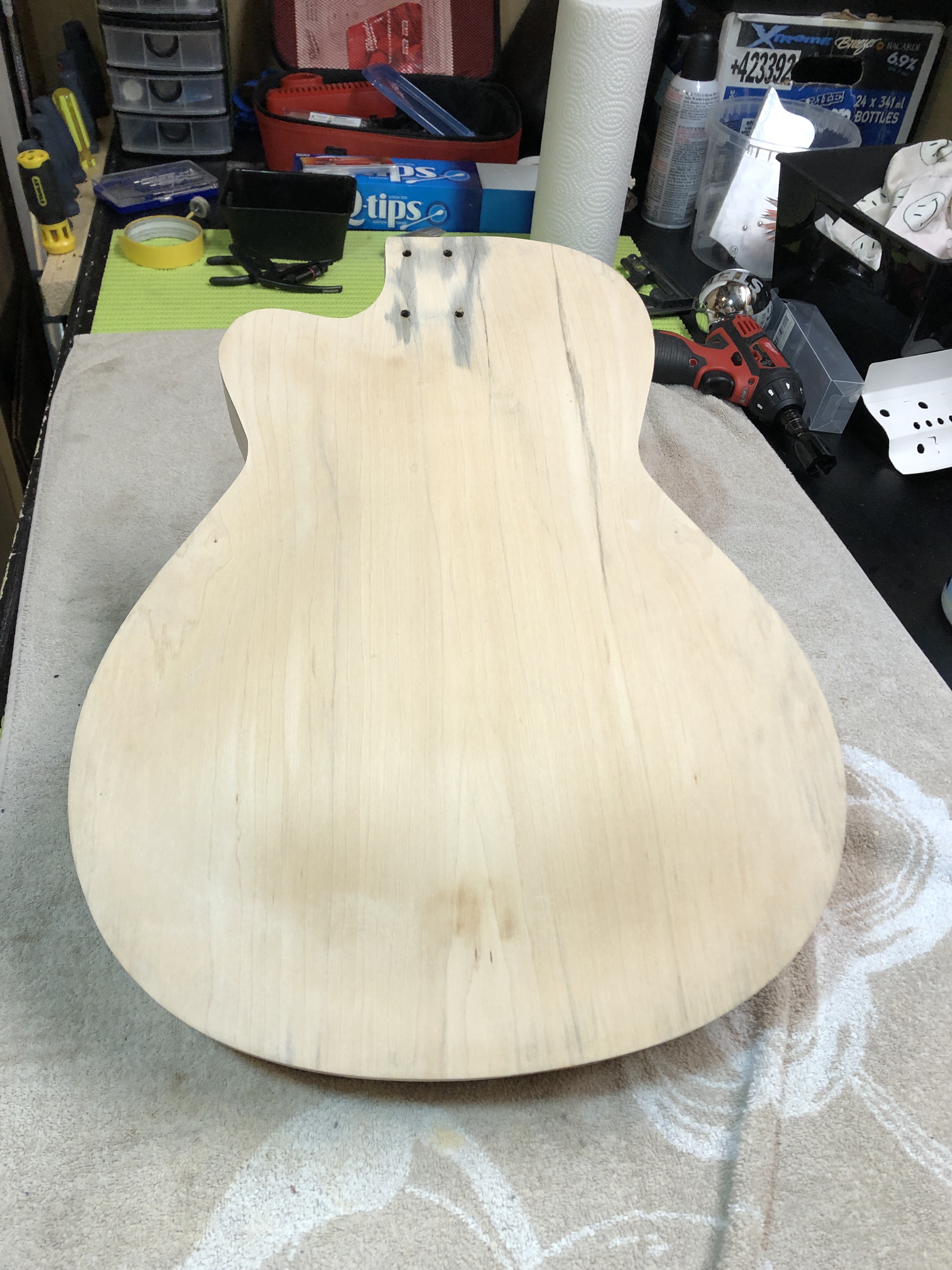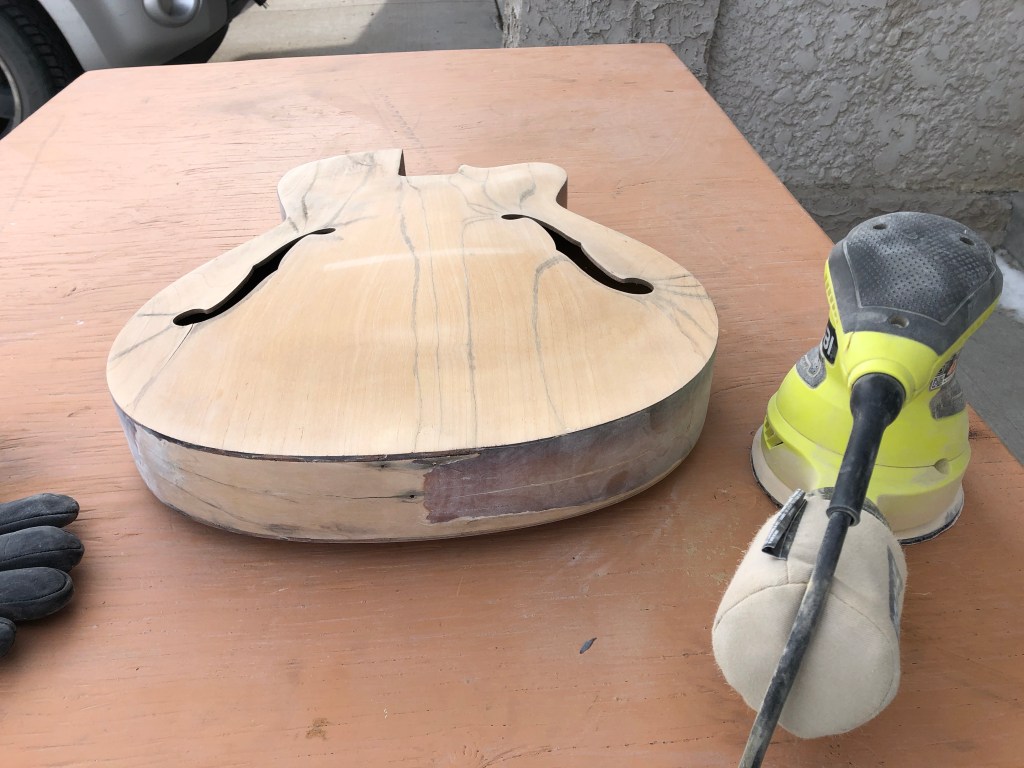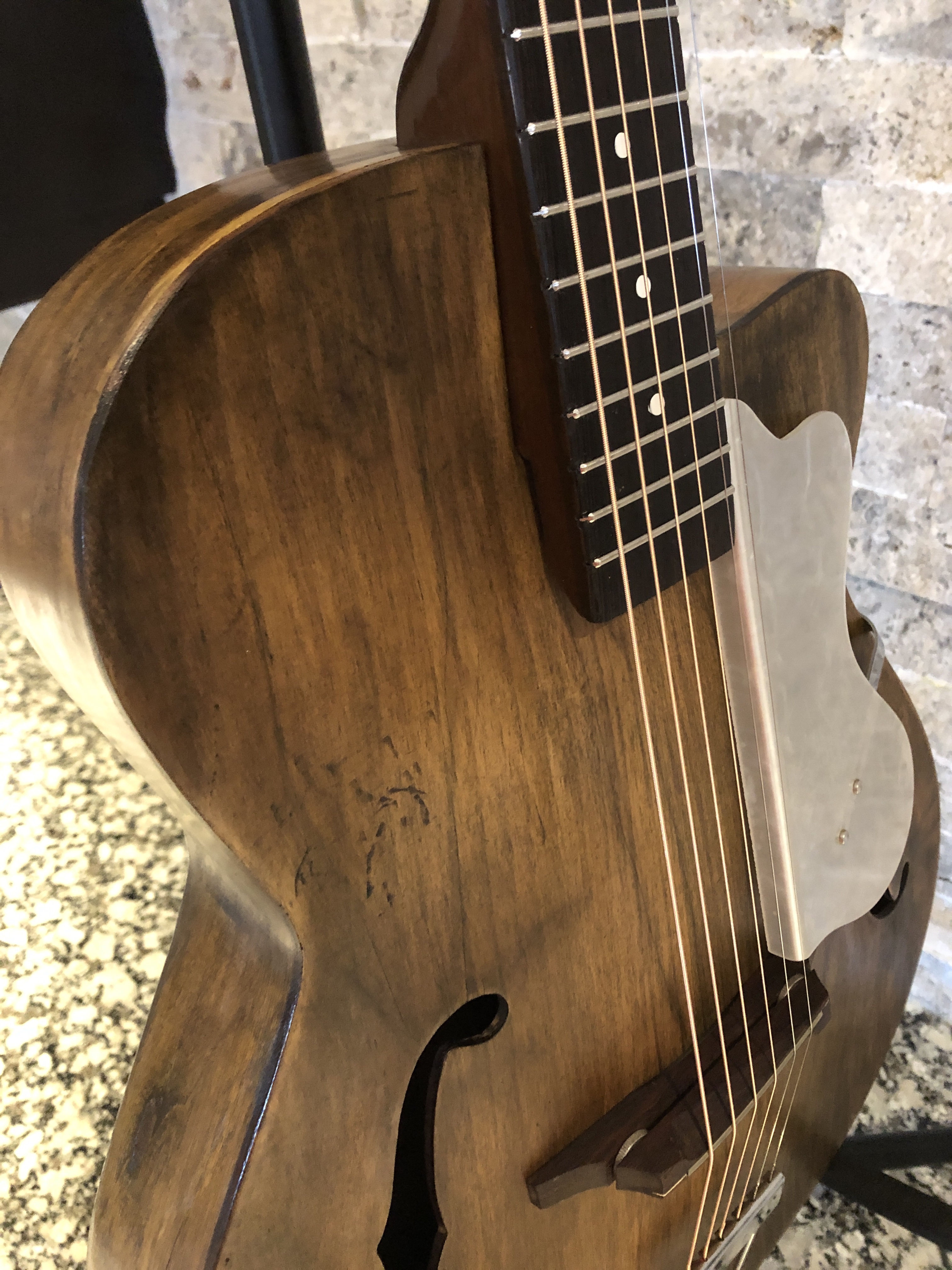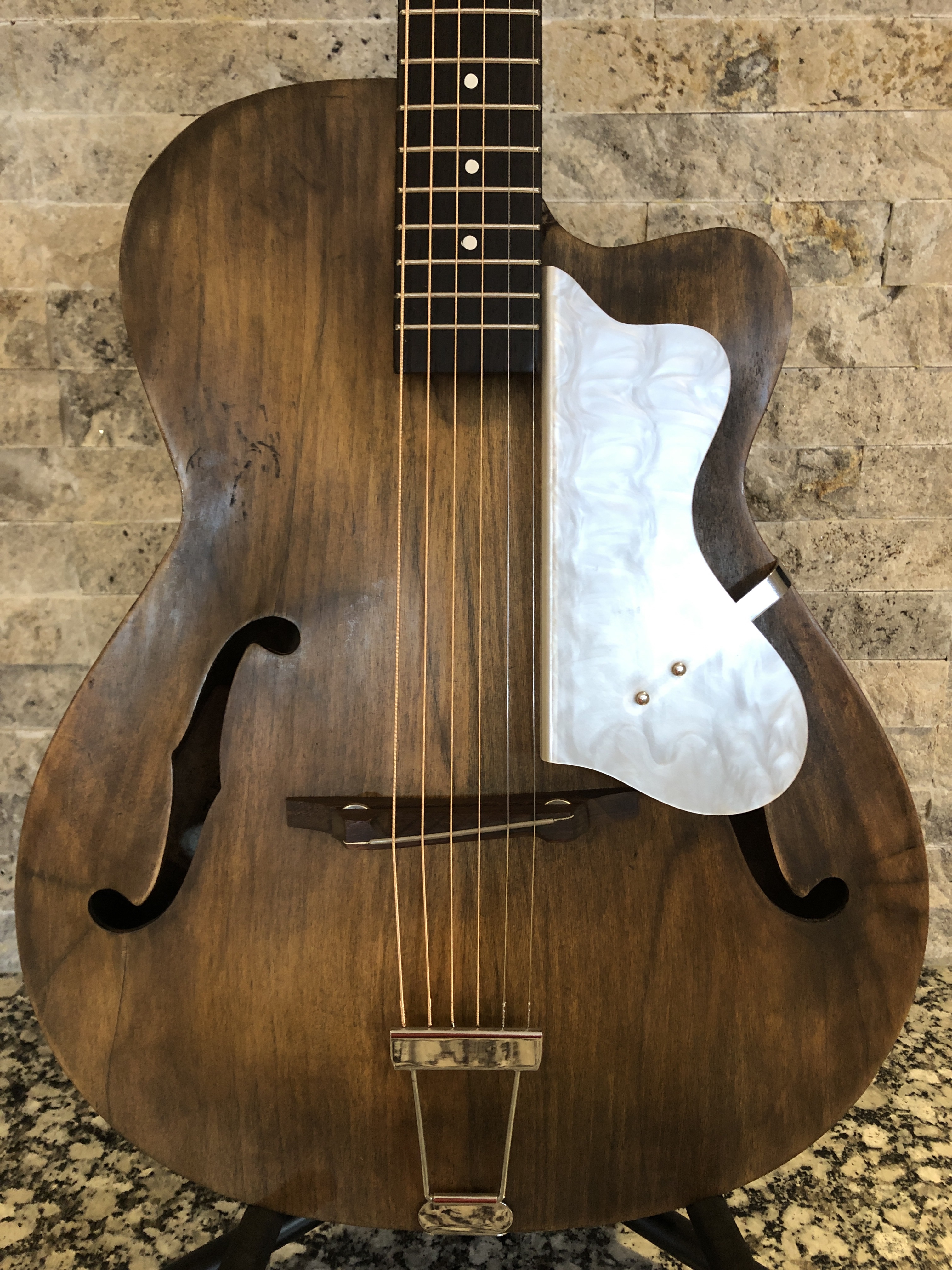 Turned out pretty well in my humble opinion. I finished it to intentionally look like a distressed and aged instrument (it was pretty distressed after all). The neck colour doesn’t quite match the body, but hey, it came out of a water filled garbage can – what do you want?!? 😆