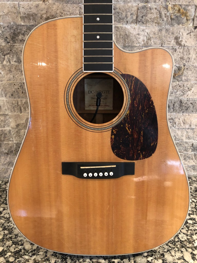 The final fix was to replaced both the saddle and nut, which (unbelievably) we’re both broken. I don’t even know how you break a saddle, but I’m sure that’s how the pickup got damaged. So I ordered Martin specific saddle and nut from Tusq, and waited for their arrival. Finished product is below, and wow, what a success. It sounds just awesome and plays like new.