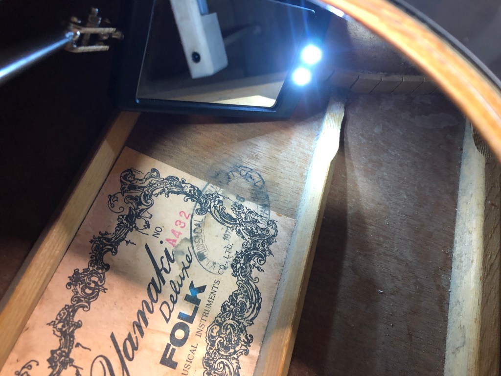 A friend of mine has a little infatuation with vintage Japanese acoustics, and has a rough time walking away from any that come his way. This 1972 Yamaki 12 string was in really rough shape, with the soundboard sunken like a bowl. He asked if I thought I could fix it ….. who am I to not at least try ….