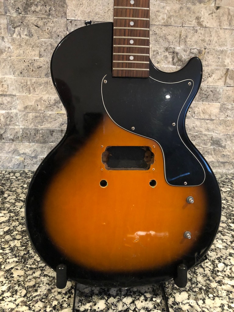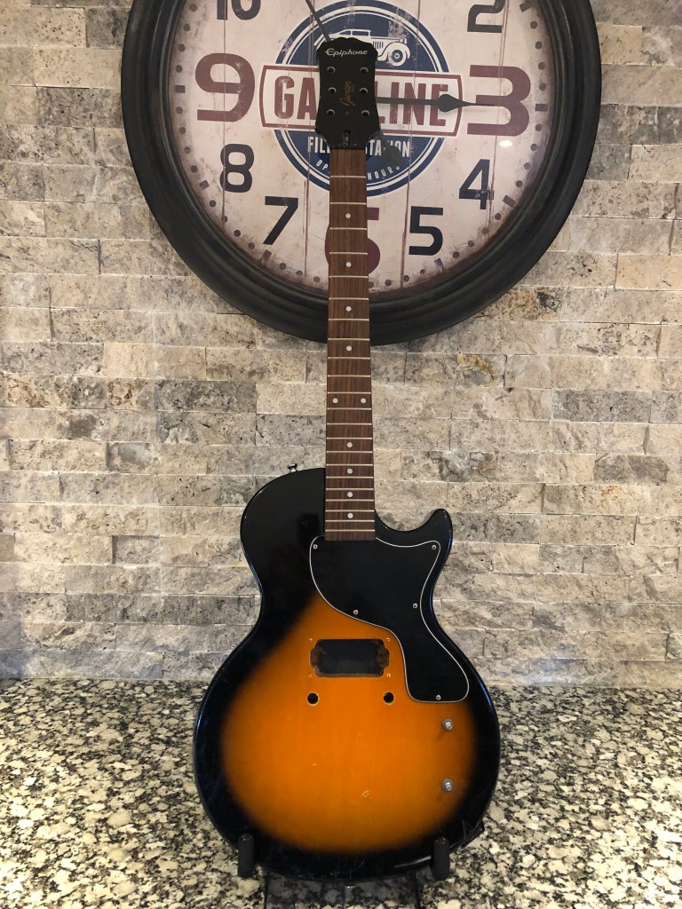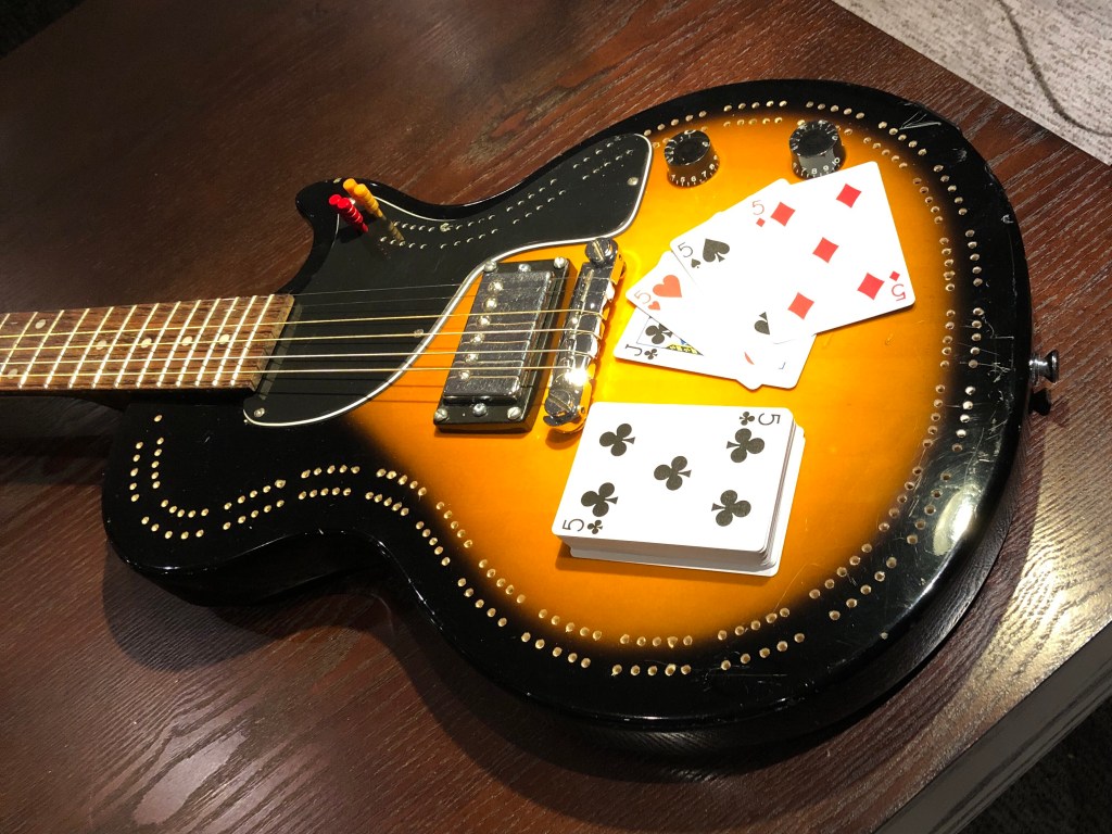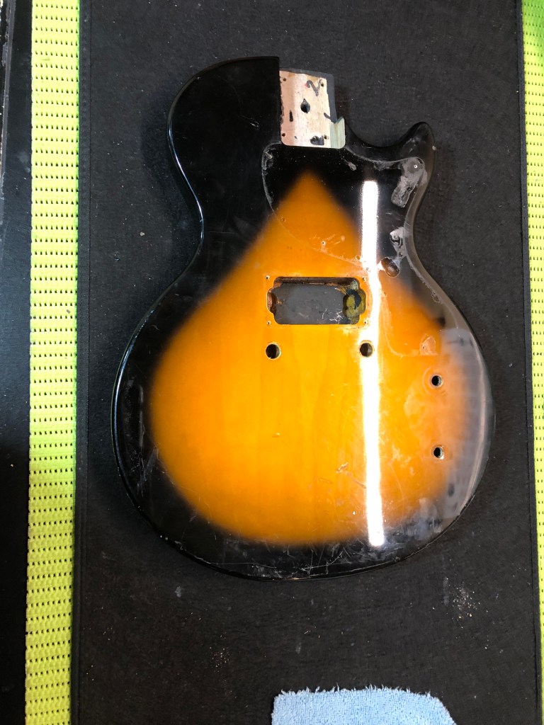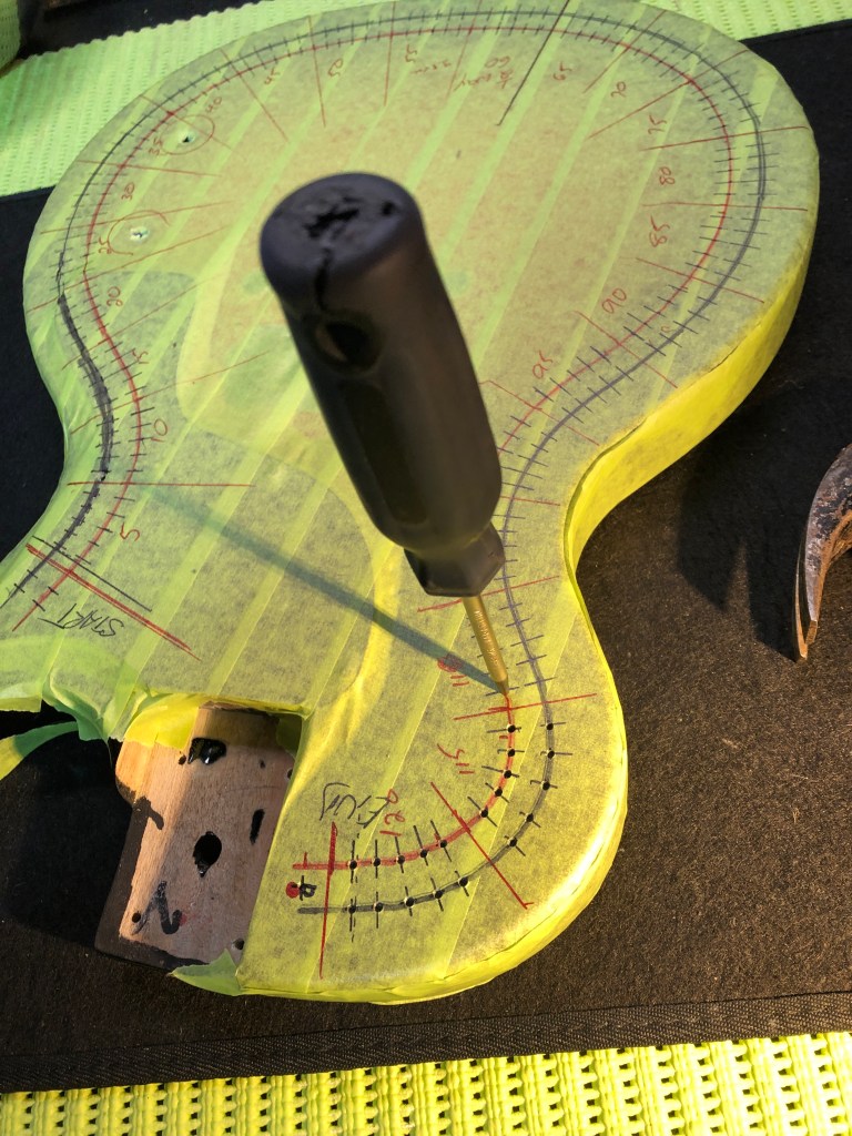What do you do with a low-end, unsalvageable electric guitar? You turn it into a cribbage board of course. I so hate instruments going in the garbage that, even when they belong there, I‘m convinced there’s a way to do something with it. See the photo progression below to see how I turned this beat up wreck into a game night axe. This is the “as is” version. It had a bag of miscellaneous parts with it, but no working pickup or electronics. Pretty grungy and scarred up too. Stripped, cleaned, chips and gouges filled. Made a jig to draw the lines for the track to contour the body. Used a length of picture hanging wire to get a perfect length of the inner (shorter) track. Measured out the blocks of 5 and drew lines perpendicular to the edge. Then measured out the holes on the inner track and used a square to make corresponding marks on the outer track. Centre punch each peg hole before drilling. Ready to drill holes with a 1/8 drill bit on a bench-top drill press. Holes drilled ok. Now to scavenge some useless parts to make it look like a guitar too. Not a real guitar restoration, but it was a fun little project. Thanks for looking.