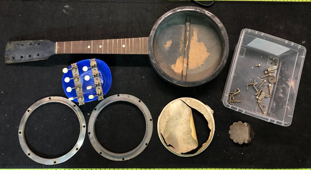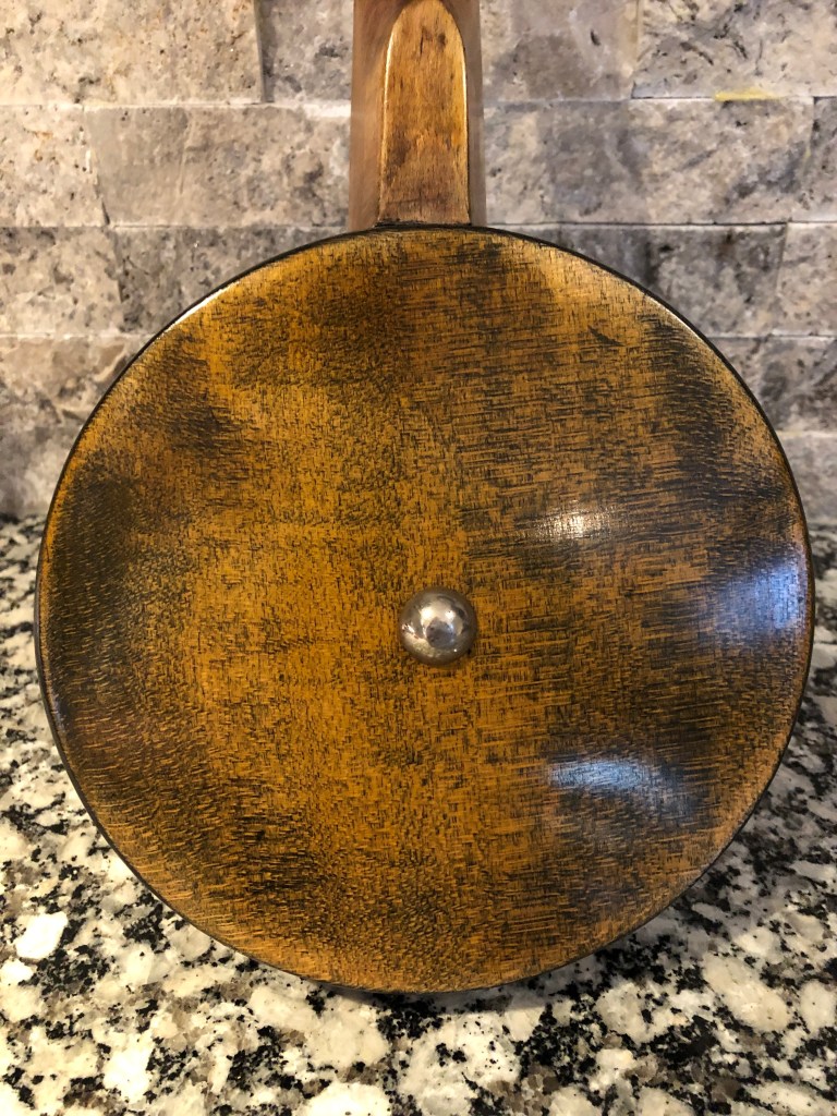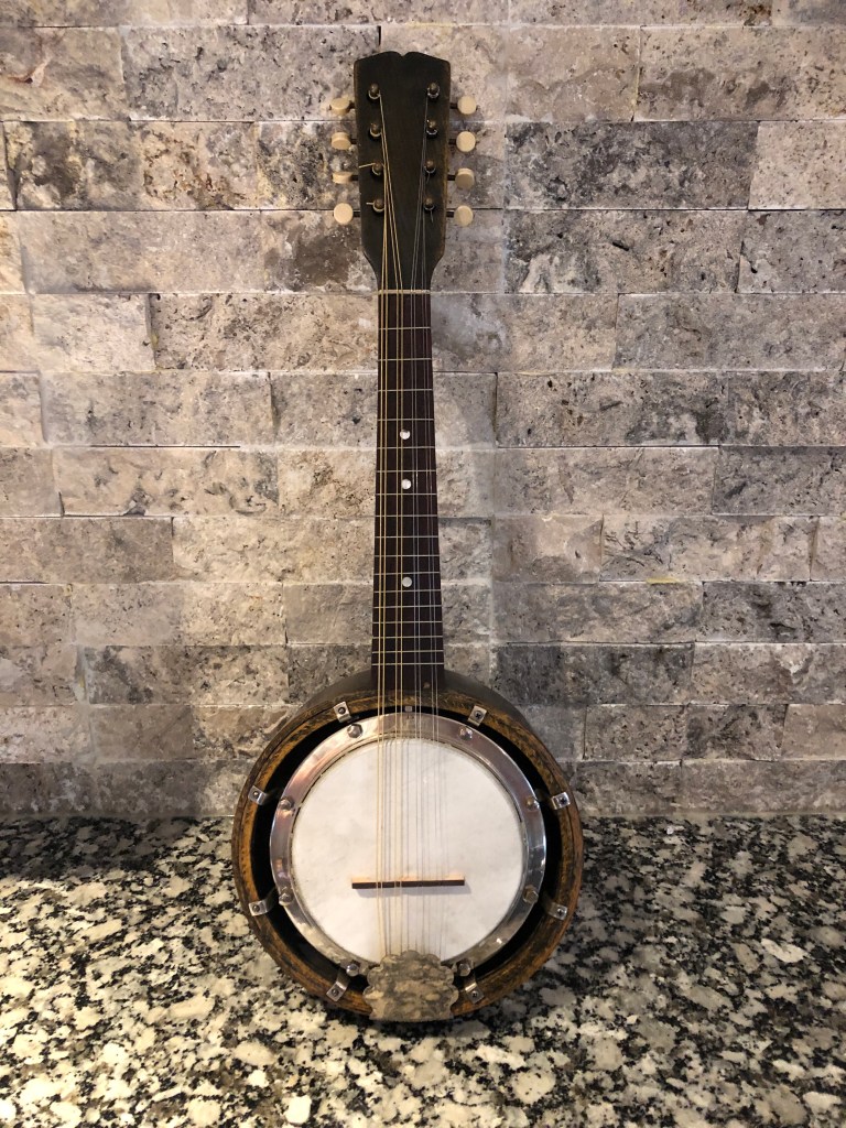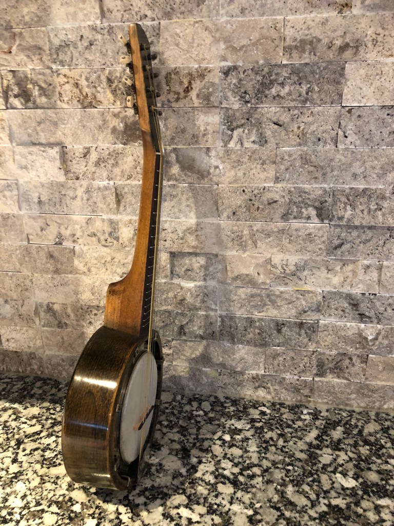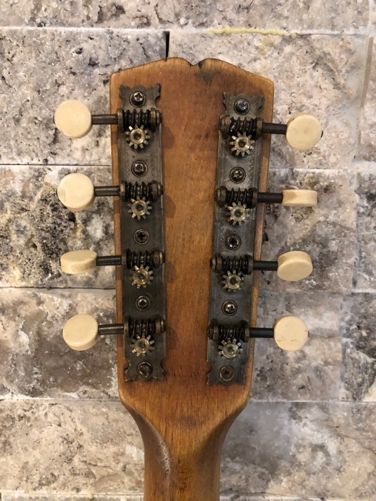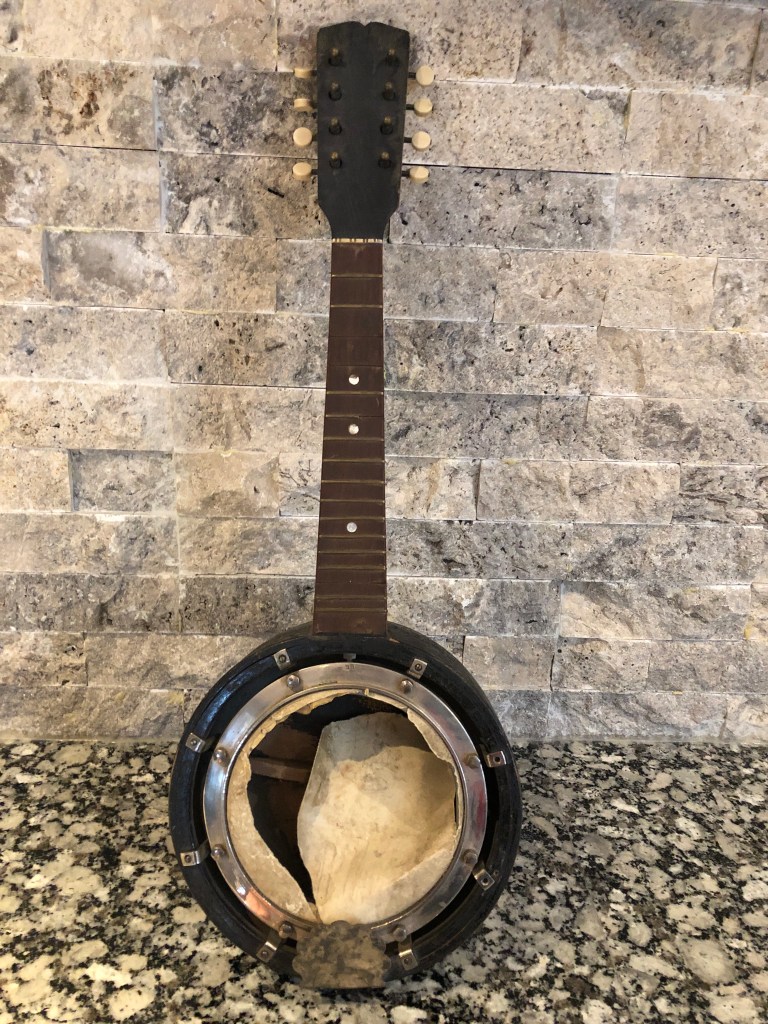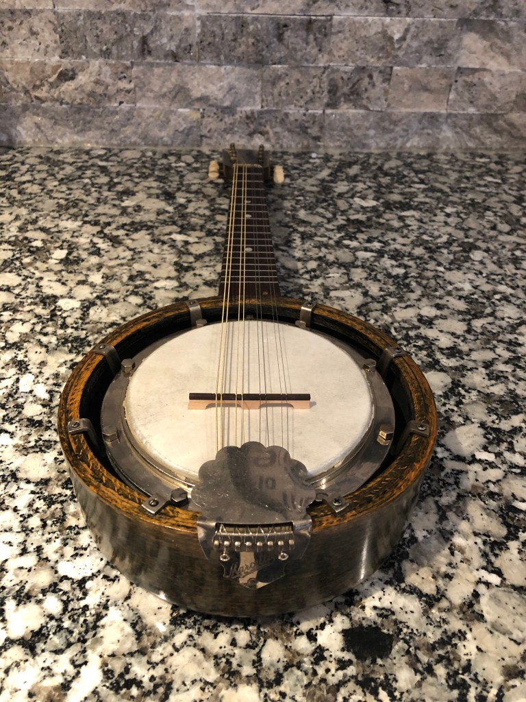 This Marcelli Banjolin was made in Germany, likely 1920s or 1930s. A fellow in downtown Winnipeg asked me if I wanted it to fix up, otherwise he was going to throw it out. I definitely put more into it than it was worth, but it was fun and I learned a new skill in re-skinning a banjo head. Before and after pics are below. Before. Not much good here. Missing frets. Back split from sides. Step one: Disassemble. Step 2: sand slivers off the body and glue what needs gluing. Step 3: WHAT THE HELL?!? This doesnβt belong here. Disregard. Step 4: sand and French polish. Step 4 (continued): French polishing is a fair bit of work. Step 5: cut new goatskin banjo head. Step 6: soak goatskin minimum 30 minutes. Step 7: place wet skin on ring. Step 8: work top ring over inner ring (I donβt know what itβs really called … itβs the ring thing that hold the skin overtop the other ring thing, pushing it down on the bottom ring thing). Step 9: trim and let dry overnight. Step 10: re-fit to body. Step 11: Recognize that you cannot buy a bridge for a mandolin, you have to buy one for a 4 string banjolele, then cut, sand and shape it to fit.Step 12: Refret the whole neck (after sanding the divots out of it of course). Then trim and file the fret ends. Step 13: reassemble, keep working that bridge until itβs the right height, add strings, magically decide what string spacing a Banjolin is supposed to have, then file string slots in the bridge. Step 14: brag about how good you are. π€₯π€«