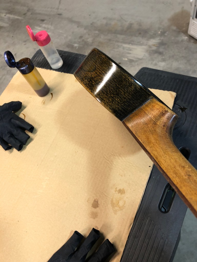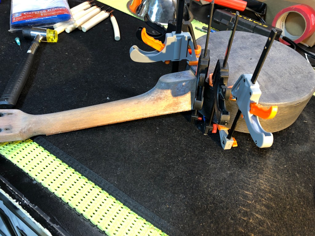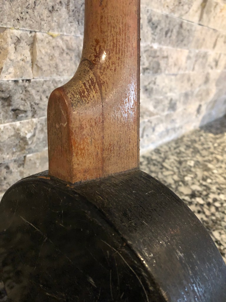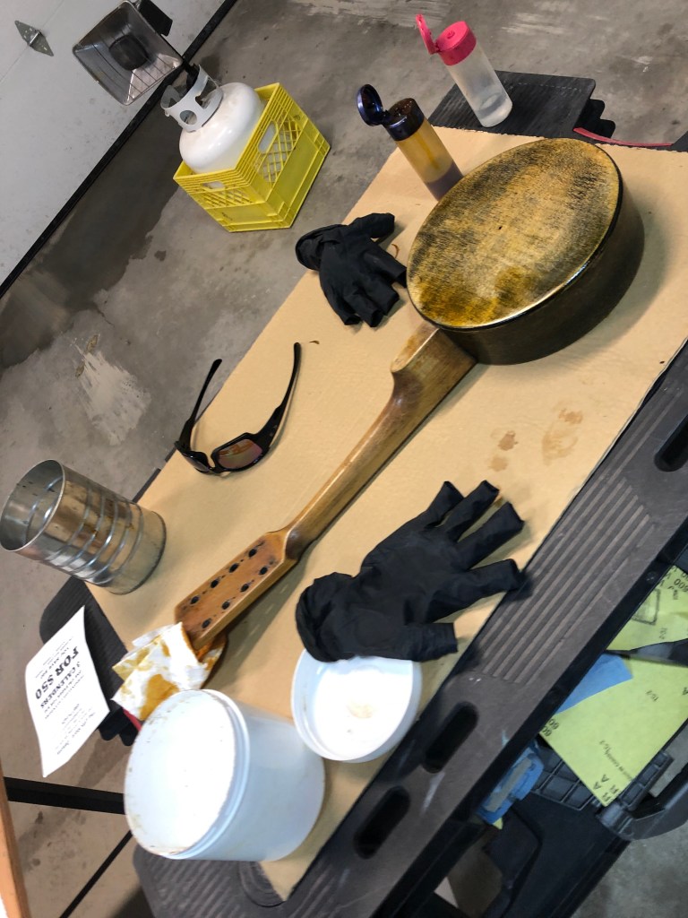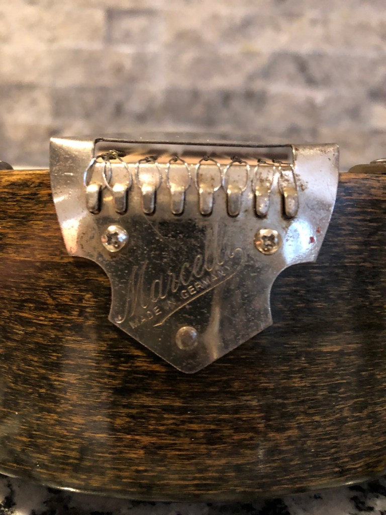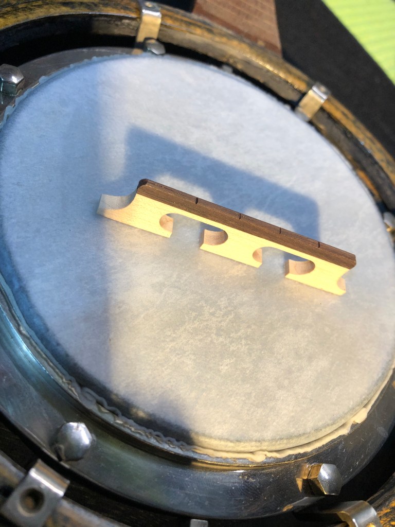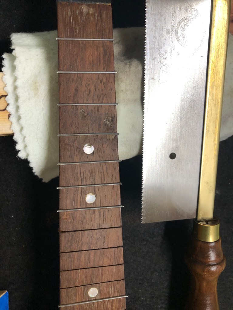 This Marcelli Banjolin was made in Germany, likely 1920s or 1930s. A fellow in downtown Winnipeg asked me if I wanted it to fix up, otherwise he was going to throw it out. I definitely put more into it than it was worth, but it was fun and I learned a new skill in re-skinning a banjo head. Before and after pics are below. Before. Not much good here. Missing frets. Back split from sides. Step one: Disassemble. Step 2: sand slivers off the body and glue what needs gluing. Step 3: WHAT THE HELL?!? This doesnβt belong here. Disregard. Step 4: sand and French polish. Step 4 (continued): French polishing is a fair bit of work. Step 5: cut new goatskin banjo head. Step 6: soak goatskin minimum 30 minutes. Step 7: place wet skin on ring. Step 8: work top ring over inner ring (I donβt know what itβs really called … itβs the ring thing that hold the skin overtop the other ring thing, pushing it down on the bottom ring thing). Step 9: trim and let dry overnight. Step 10: re-fit to body. Step 11: Recognize that you cannot buy a bridge for a mandolin, you have to buy one for a 4 string banjolele, then cut, sand and shape it to fit.Step 12: Refret the whole neck (after sanding the divots out of it of course). Then trim and file the fret ends. Step 13: reassemble, keep working that bridge until itβs the right height, add strings, magically decide what string spacing a Banjolin is supposed to have, then file string slots in the bridge. Step 14: brag about how good you are. π€₯π€«