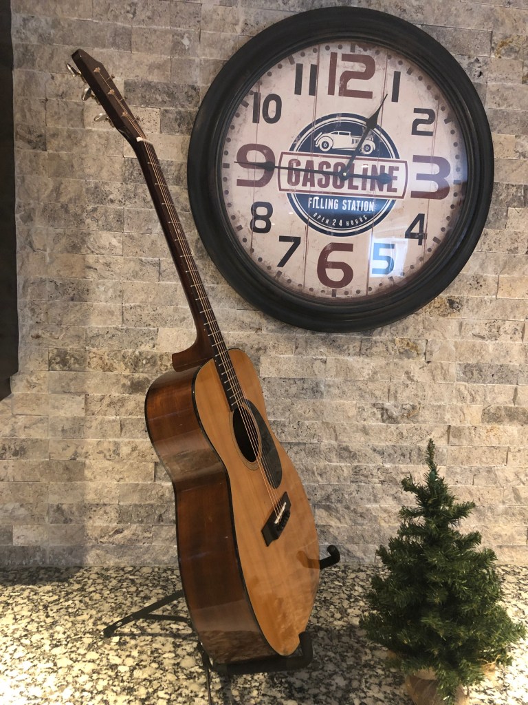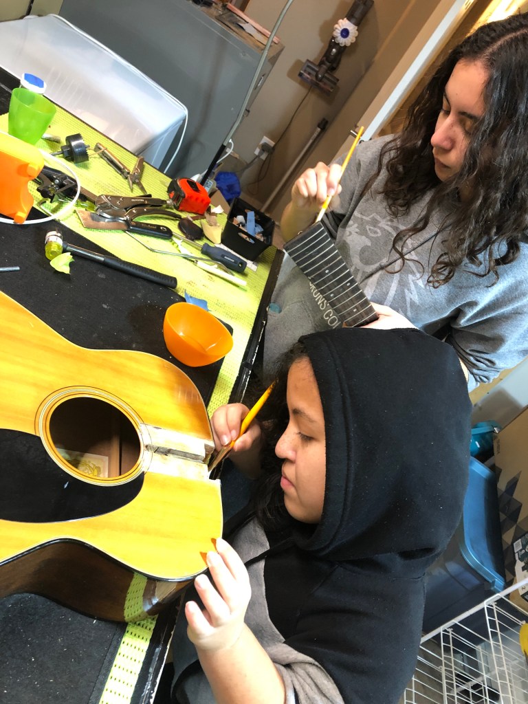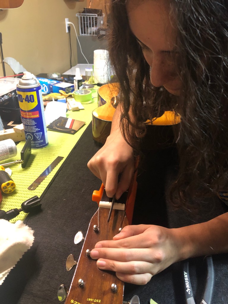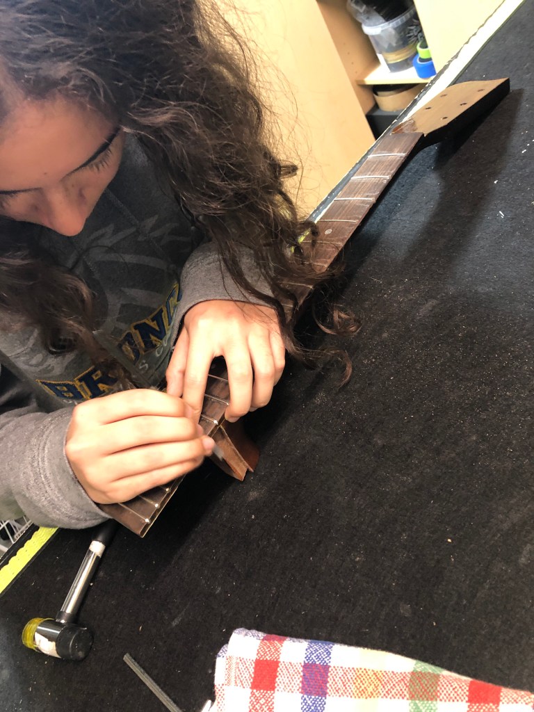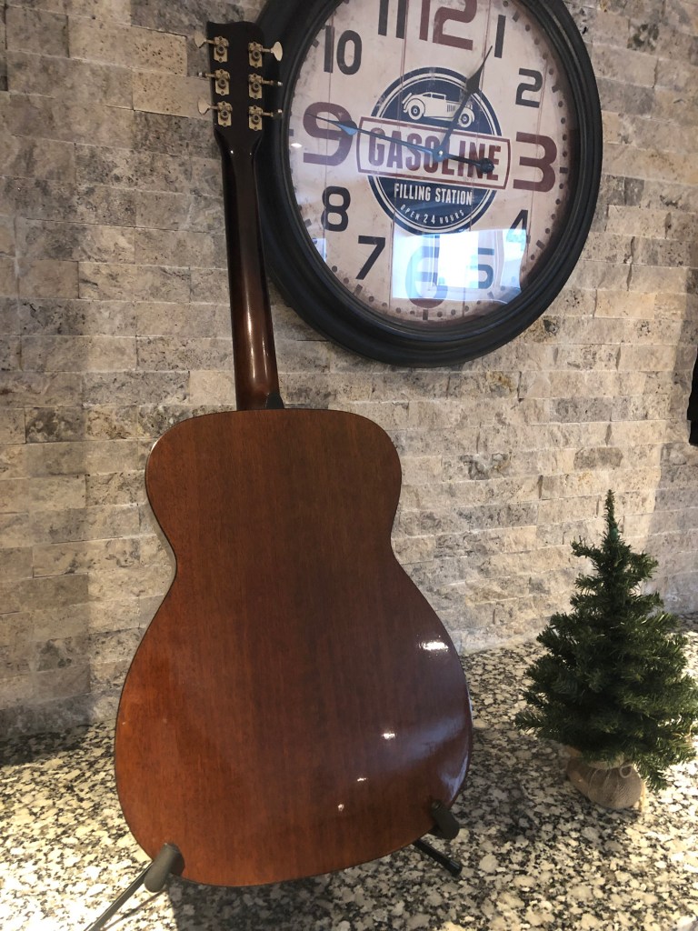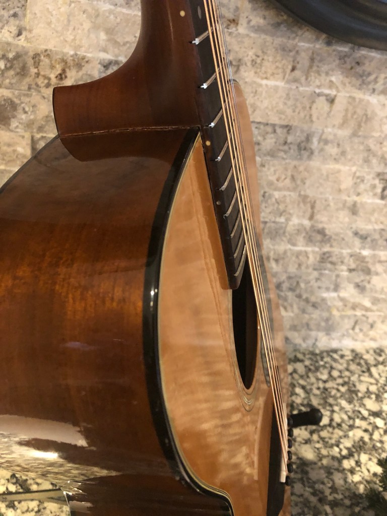 The neck is sitting loosely in the dovetail joint. Replacing the 15th fret … install, snip, file, file, file, sand, level, buff, perfect. Both kids get in on brushing hide glue into the dovetail and onto the neck and fretboard extension. After the neck dried, time to install the bridge …. this picture belies the complexity though… lots of measuring and testing to get it all aligned and ensure the intonation would be good. And wait for it to dry. Nice solid ebony bridge, ebony bridge pins with abalone insert are coming too. Learning how to setup the nut and saddle. And….. plays GREAT!Thanks for looking. Merry Christmas.