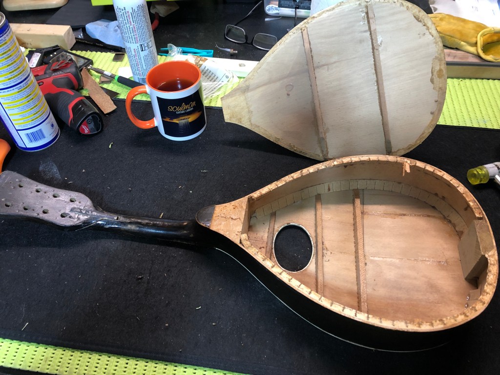 Broken headstock, no nut, no saddle, body coming apart, loose braces, top cracks, etc…Not much holding the back on. Gotta start somewhere. Back came off without damage. Notice the strategically placed coffee mug, gratuitously advertising Soulman Guitars Canada. (If you want luthier grade guitars at Walmart prices, you simply must explore Soulman Guitars – no joke, I own them and I play them). All back braces were loose. Removed and now being re-glued. By the way …. I almost never splurge on the purchase of “special luthier tools”. If grandpa could build his whole house himself with a hand saw, a hammer and some nails (and live in it for 70 years) then I figured that many everyday tools can be easily adapted for luthier work (for repair work anyway). So-far-so-good. Repairing tail-block and slight top separation while the back sets up. Spruce cleats added wherever a top crack was through-and-through. Reassembly time. Aaaaannnnddd ….. wait. Making a bridge from a piece of old ebony (repurposed from an old archtop guitar bridge). Shaped, sized and now figuring out string spread. I don’t know nuthin bout mandolins, but looks kinda like it’s supposed to?!?Couple of the tuning pegs are a little bent, but these are original and hold tuning just fine, so I didn’t mess with them. Voila!