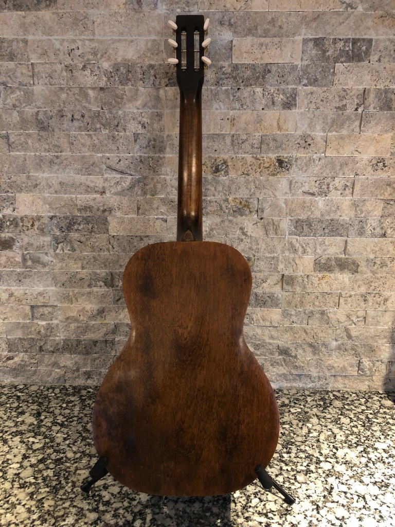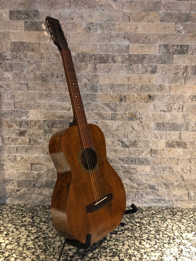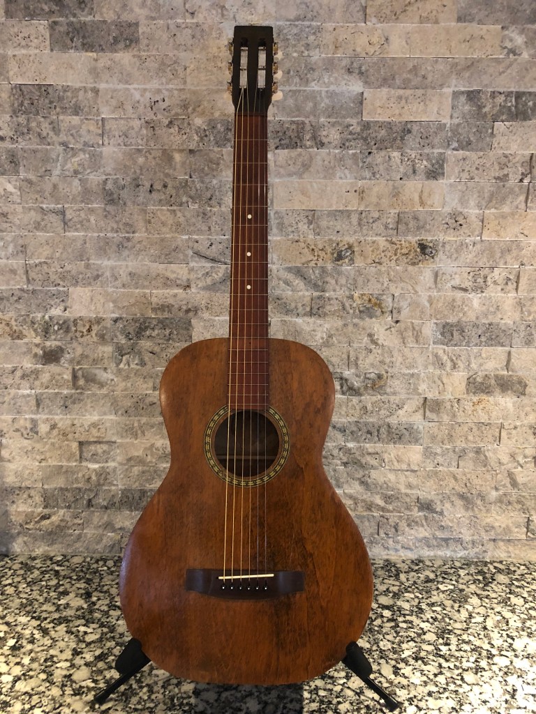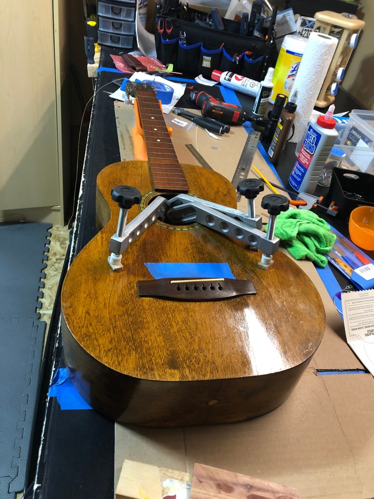 This is another one that I gave to my daughter and walked her through the restoration. She re-glued all the braces, cleated the top crack, french polished the body and neck, fit a new bridge, put on new tuners and strung it up with Ernie Ball Earthwood ultra lights.