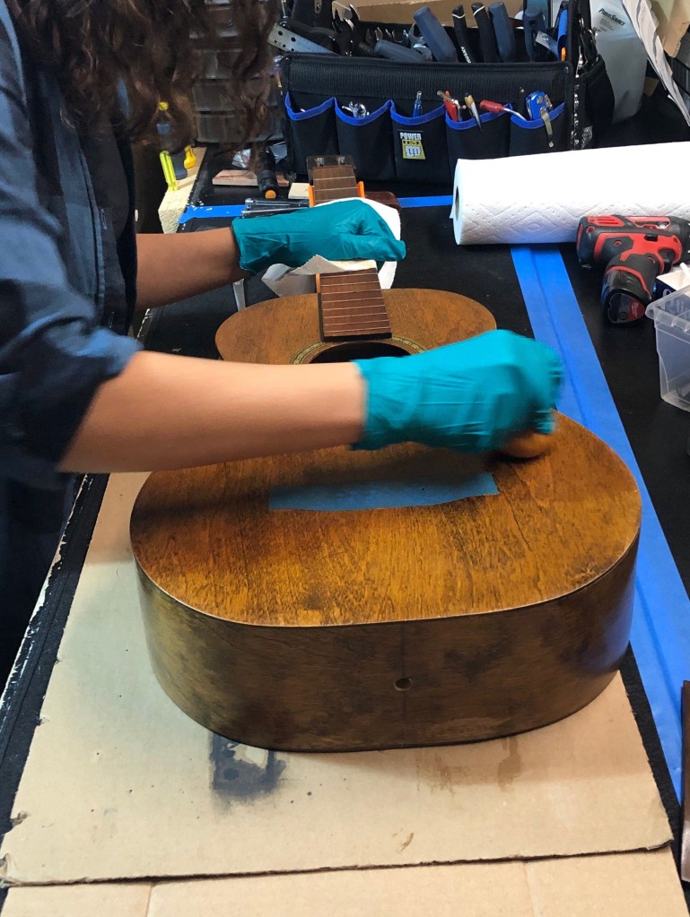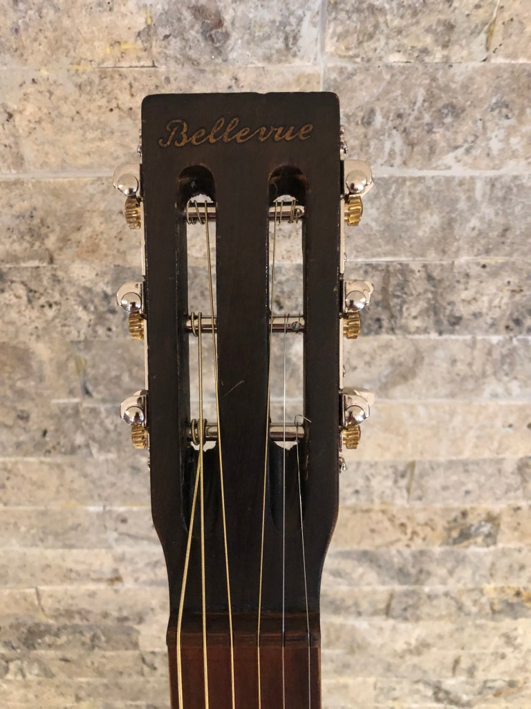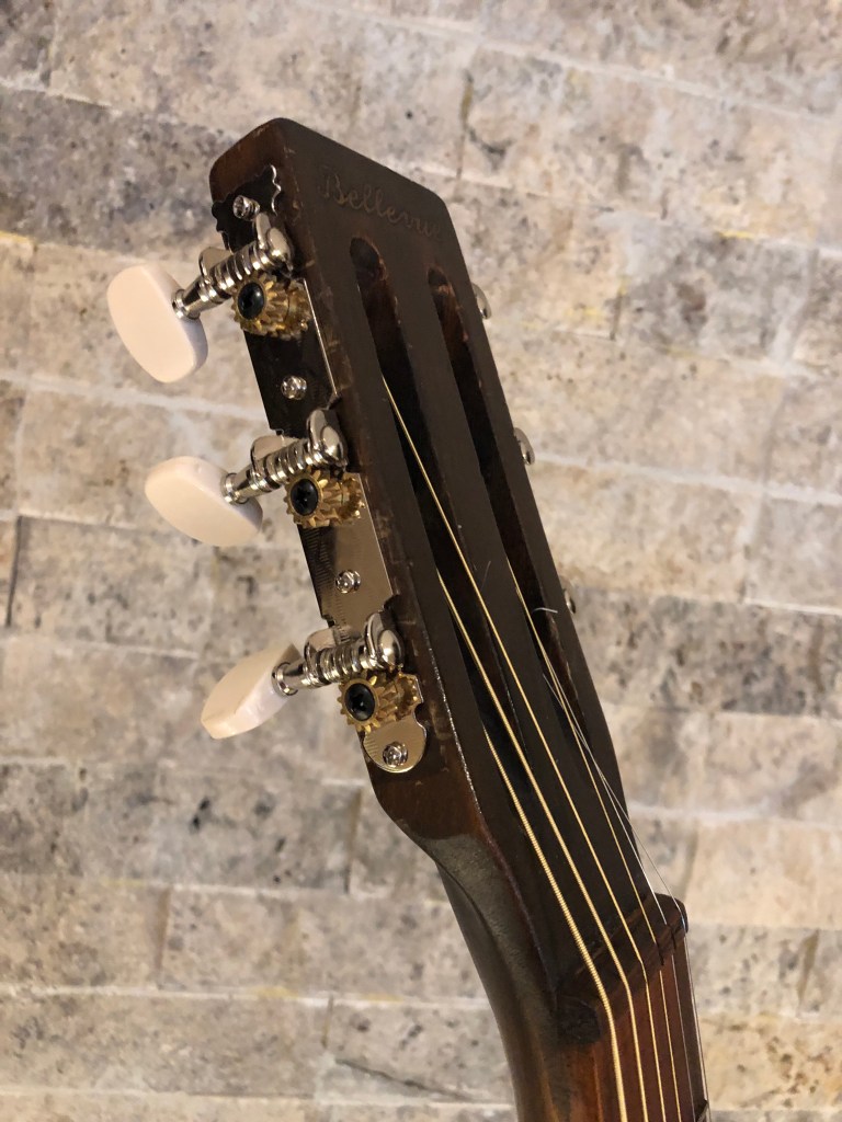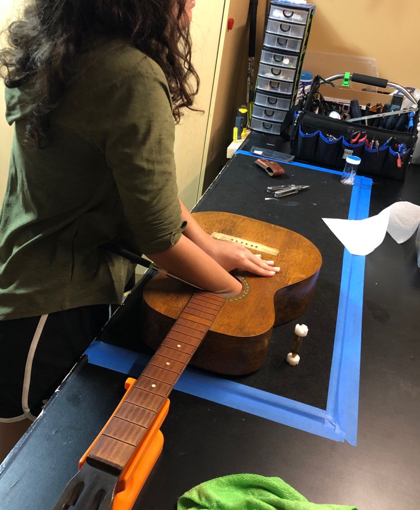 This is another one that I gave to my daughter and walked her through the restoration. She re-glued all the braces, cleated the top crack, french polished the body and neck, fit a new bridge, put on new tuners and strung it up with Ernie Ball Earthwood ultra lights.