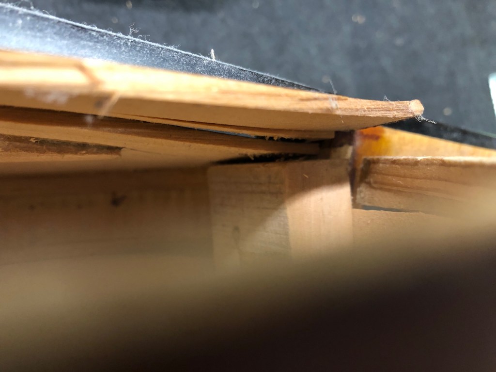 Step 3: start rebuilding the top. This portion I used thicker pieces of wood near the top because I was spanning three cracks, and because near the neck block it doesn’t need to resonate as much anyway. Traded wood flexibility for structural stability in this area.