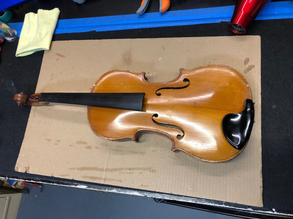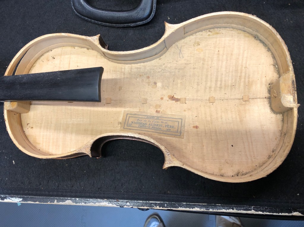 What follows below is the pictorial transition from broken to unbroken. If you’ve read my other posts, you’ll know that I usually try to use reclaimed parts and pieces in my restorations. This one is no different. To cleat the breaks I used two sources of wood: bits of cedar that were salvaged from my previous Almansa project (fitting since that Almansa was a school’s guitar), and pieces of old reclaimed spruce siding that I sanded down paper thin. It was the only way I could get something flexible enough to contour one portion of the violin top. You’ll see as we go.