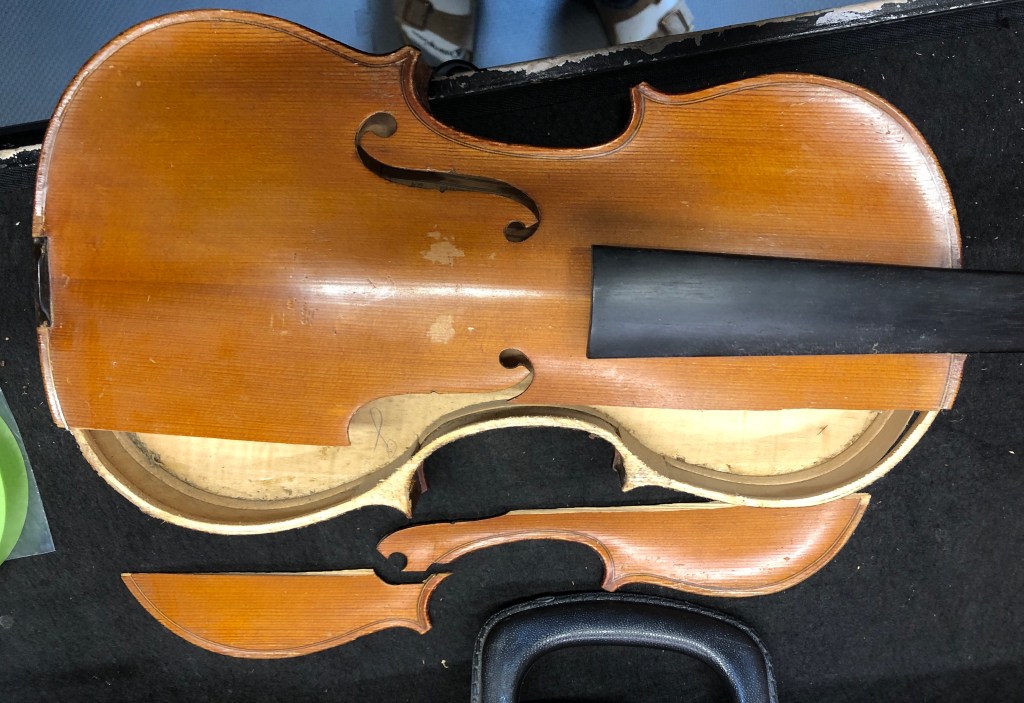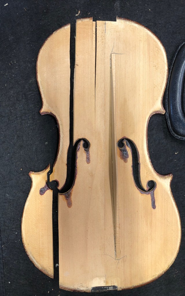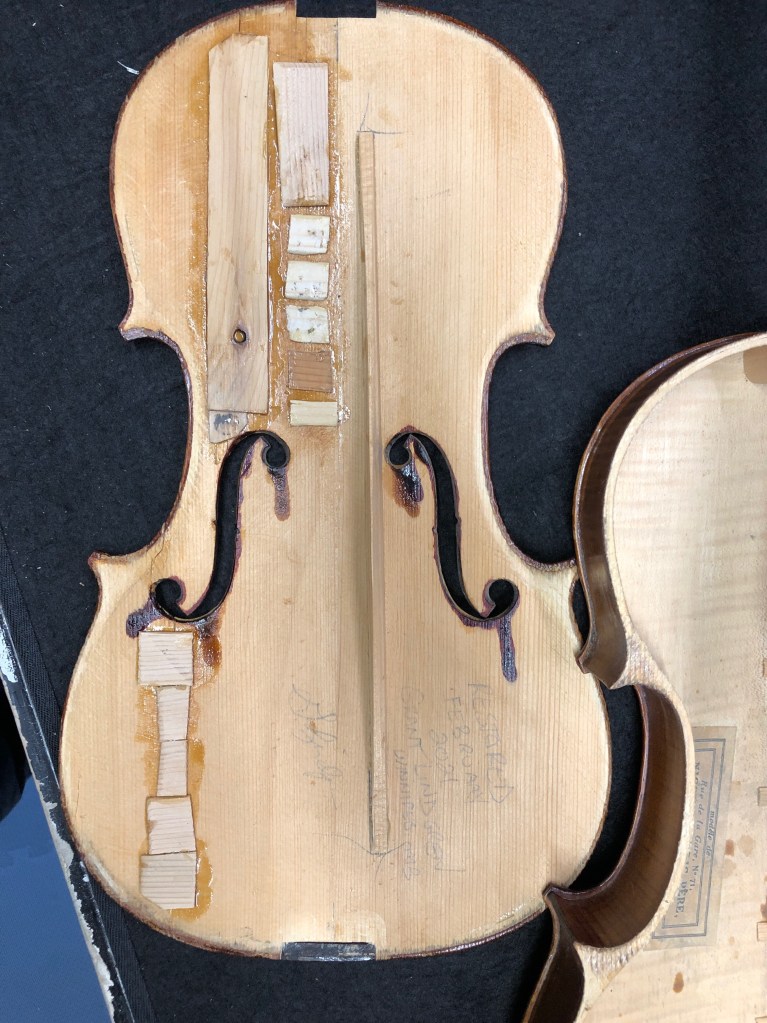 Step 4: reattach broken pieces. The top bout you can see the long and very thin piece of spruce siding I used. There is lots of contour there and this was the only way to make it solid. That piece of spruce is about the thickness of a standard filing folder.